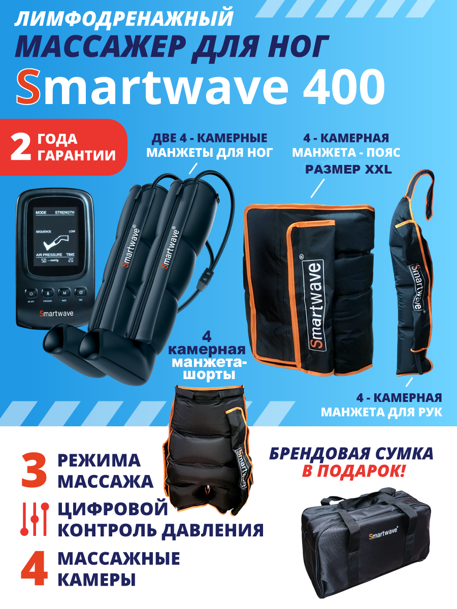 Массажер лимфодренажный Smartwave 400 для тела: для ног, для руки, пояс XXL и шорты — 4 камеры, 3 режима, от сети, сумка: сравнение цен, характеристики, фото, актуальное наличие и цены.
