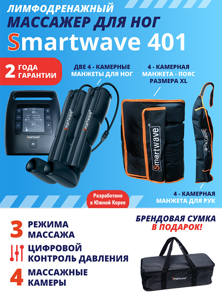 Купить Массажер лимфодренажный Smartwave 401 для ног, для руки и пояс XL, 4 камеры, аккумулятор, сумка с доставкой по всей России.