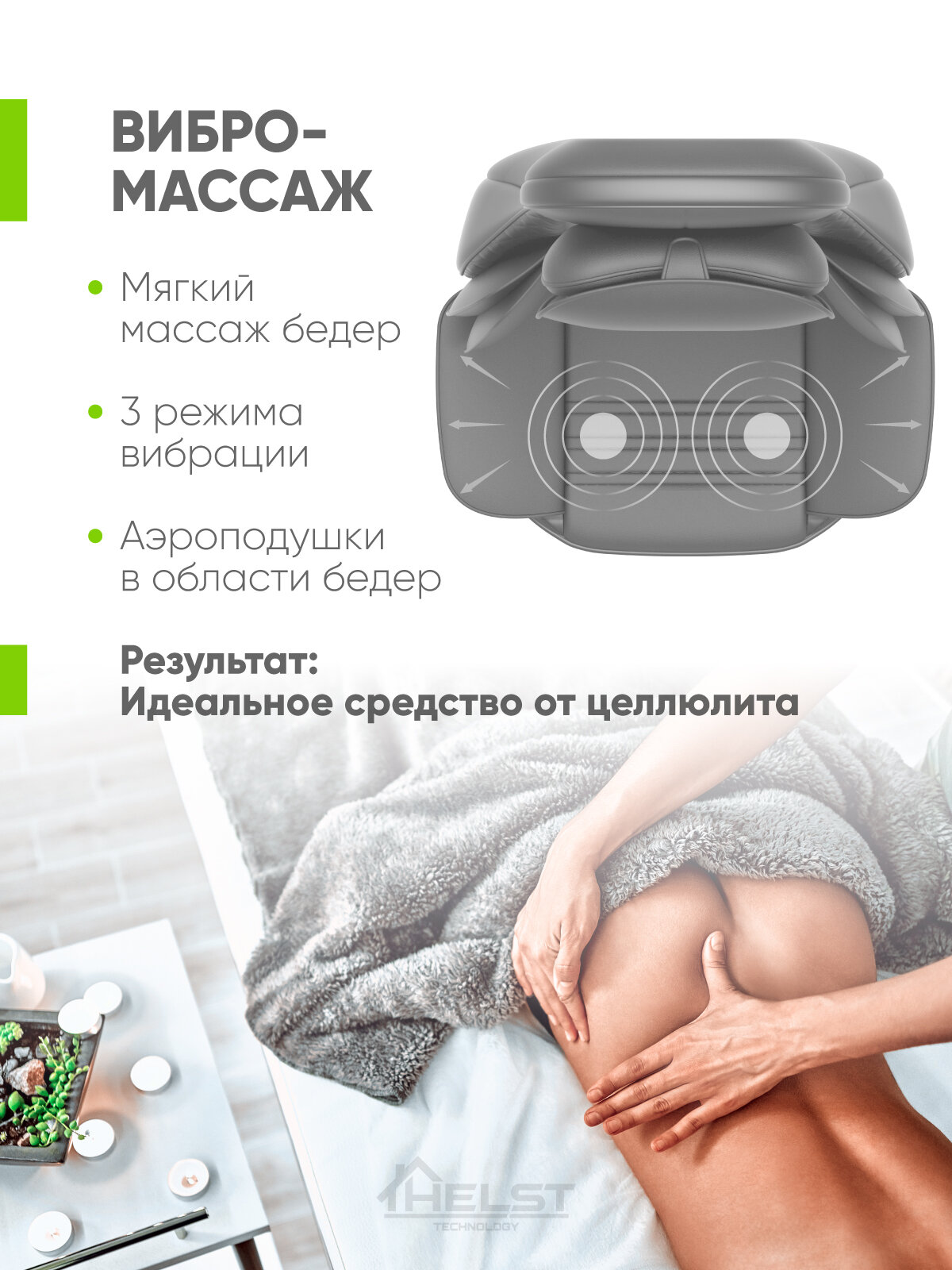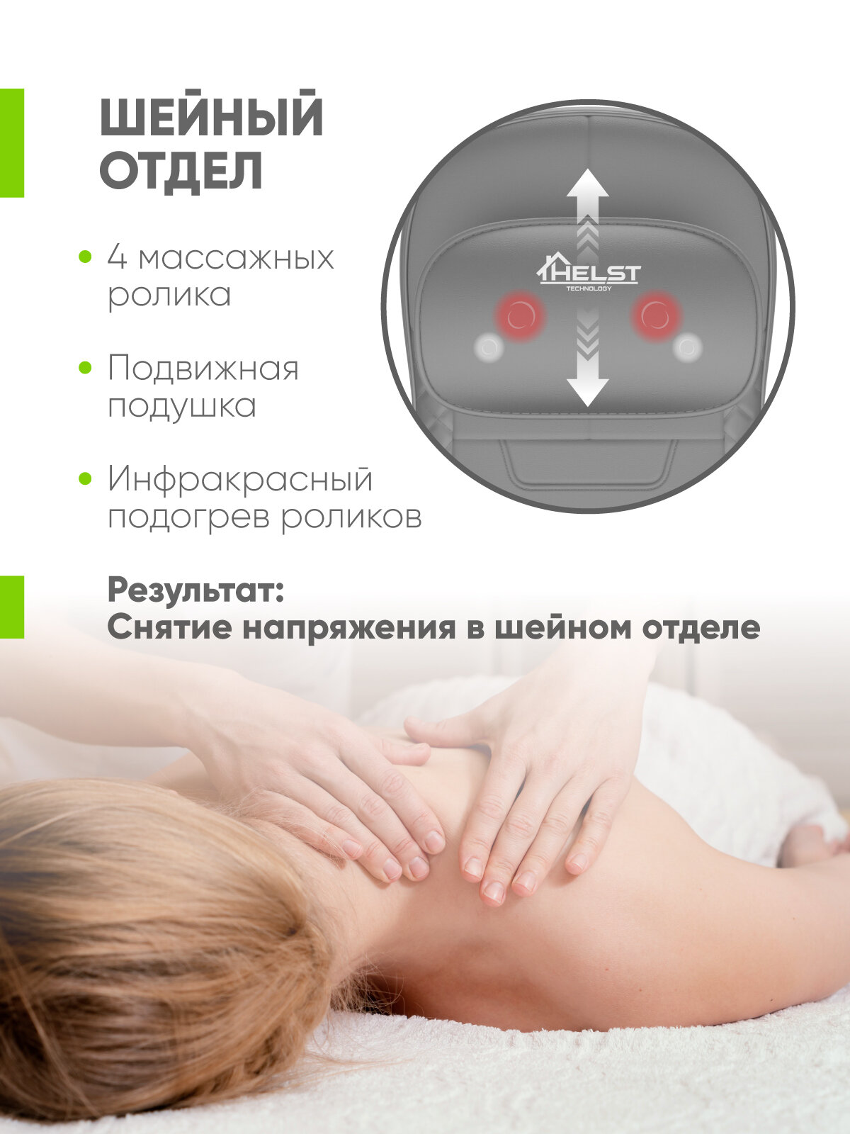 HELST HMC-3000 - это не только массажная накидка, но и средство для повышения комфорта и расслабления. Благодаря сочетанию различных техник массажа эта накидка поможет вам избавиться от усталости, улучшить кровообращение и повысить тонус мышц. Если вы хотите получить максимум пользы от массажа, то массажная накидка от HELST - это идеальный выбор для вас.