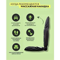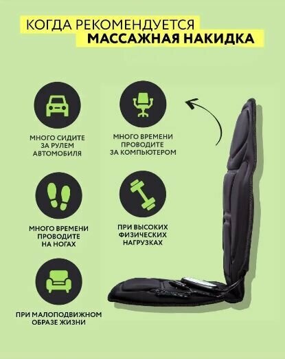 Универсальная массажная накидка для использования дома или в автомобиле. Пять вибрационных моторов. Три зоны массажа, включаемых раздельно. Для каждой зоны можно выбрать один из двух уровней интенсивности. Отдельно включается функция обогрева спины. Массажер работает от бытовой сети 220 В или от автомобильного адаптера (входит в комплект поставки). Простой и удобный пульт управления. Гибкие крепежные ремни. Адаптер для подключения к бортовой сети автомобиля. Источник питания: 220 В или 12 В от автомобильного адаптера. Мощность: 12 Вт. Размеры: спинка 65 х 48 см, сиденье 42 х 50 см.
