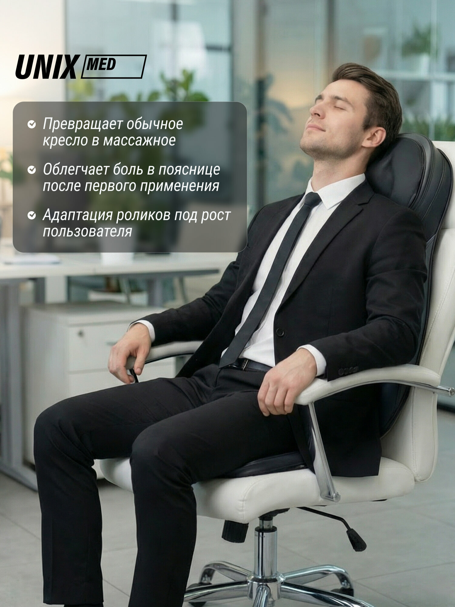 Именно такую возможность дарит массажная накидка с прогревом UNIX Flex Relax Black. Этот массажер для тела обеспечит глубокий и эффективный массаж тела дома и в автомобиле.Unix Flex Relax Black оснащена 12-ю встроенными массажными роликами: