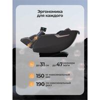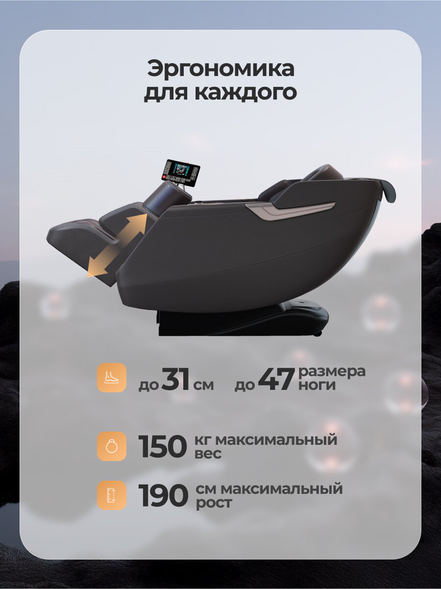 Технология ZenAir с 21 воздушной подушкой охватывает плечи, икры, стопы и создает воздушно-компрессионный массаж, способствующий улучшению кровообращения, снятию отечности и расслаблению. Для дополнительного комфорта предусмотрены специальные воздушные подушки в области бедер, которые усиливают общее воздействие на нижнюю часть тела. Отдельная воздушная подушка в зоне головы поддерживает корректное положение шеи и дополняет проработку шейно-воротниковой зоны.