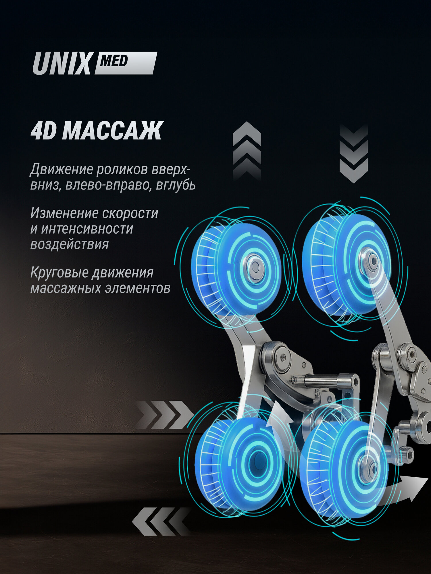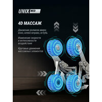 - Воздушно-компрессионные подушки делают массаж ног, икроножных мышц и рук. Они подстраиваются под анатомию пользователя, что поможет быстрее снять неприятные ощущения в мышцах. В массажном кресле UNIX Med Afelia предусмотрена функция роликового массажа ног и массажер для икроножных мышц. Автоматическое выдвижение подставки для ног, а также функции роликов для поднятия и опускания стопы поможет расслабиться после активного дня и борьбы со стрессом.
