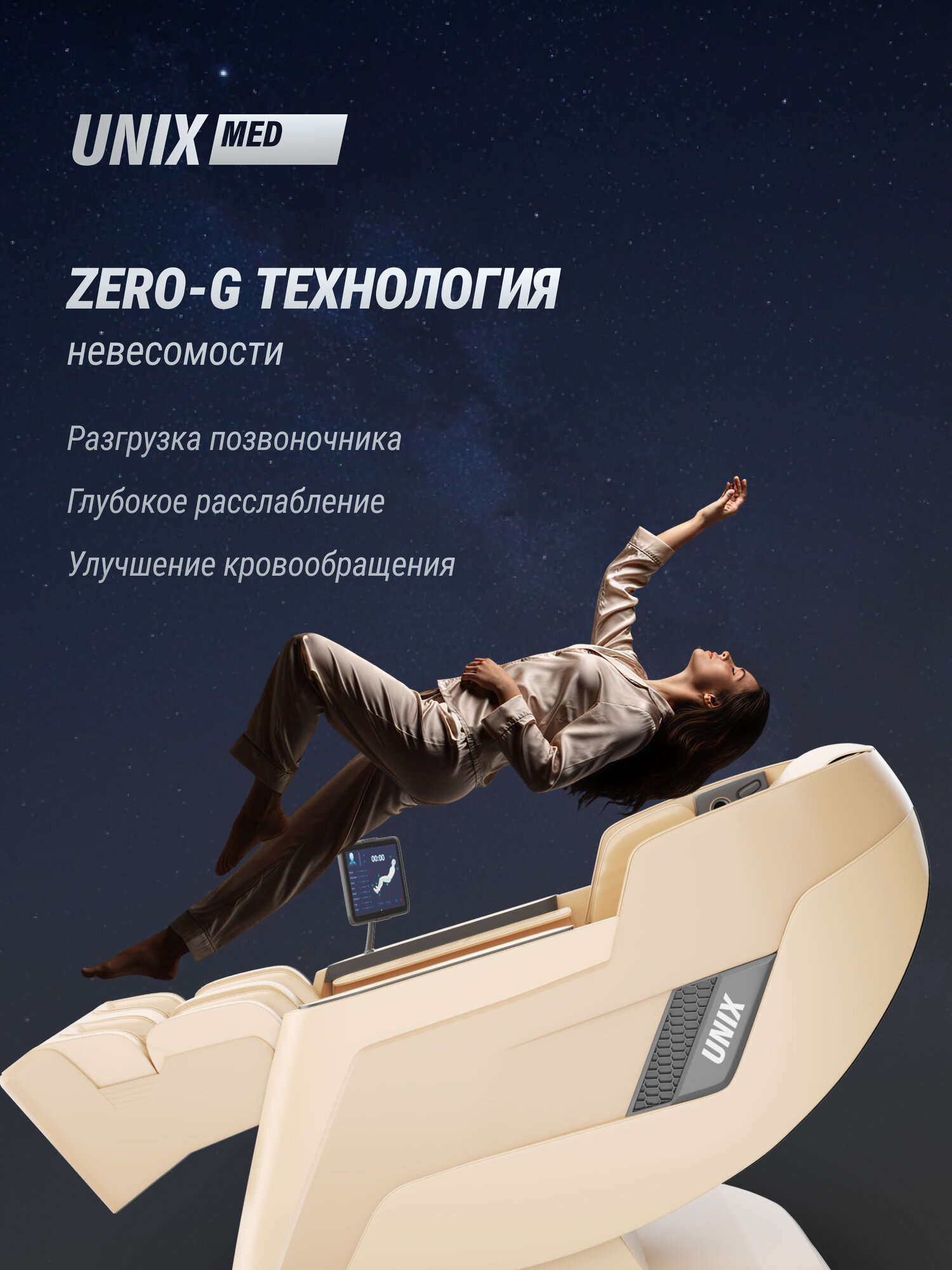 - ZERO GRAVITY. В режиме ZERO-G вы можете в ручную выбрать угол наклона. Нагрузка распределяется равномерно по телу, возникает ощущение легкости, сравнимое с состоянием невесомости. С этой функцией тело находится в самом комфортном положении, оно максимально расслабленно, а значит, пользы от массажа будет гораздо больше, чем в любом другом положении. В состоянии невесомости нагрузка, действующая на позвоночник, равномерно распределяется по поверхности кресла. Снимаются спазмы в мышцах спины и шеи, улучшается кровообращение, восстанавливаются жизненно важные процессы, улучшается сон. ZERO-G подойдет для релаксации и оздоровления людей, занятых на тяжелых работах, офисных сотрудников, спортсменов, водителей авто, а также людей испытывающих большие нагрузки на работе и дома.