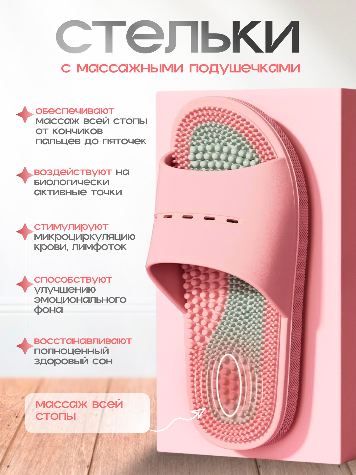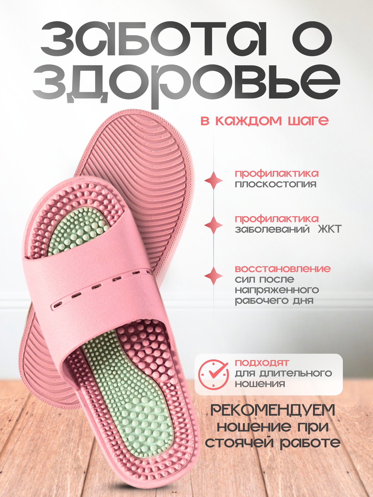 Откройте для себя новый уровень комфорта с массажными тапочками Релаксы. Тапочки не просто обувь для дома — это настоящий источник оздоровления для ваших ног. Мягкие шипы на стельке массируют акупунктурные точки, снимая напряжение и усталость после долгого рабочего дня. Их универсальный дизайн делает их подходящими как для мужчин, так и для женщин. Кроме того, наши тапочки шиацу обладают ортопедическими свойствами, что делает их идеальными для использования в течение длительного времени. Преимущества: Снятие отечности: Уникальный массаж стоп способствует улучшению кровообращения, что помогает избавиться от отечности. Укрепление здоровья: Стимуляция микроциркуляции крови и лимфотока способствует общему укреплению организма. Комфорт и стабильность: Тапочки отлично сидят на ноге и не скользят, обеспечивая безопасность при использовании в домашних условиях, в гостиницах или на даче. Удобство в использовании: Легкие и прочные, они идеально подходят для отдыха на пляже в бассейне или использования в душе и ванной. Изготовленные из прочного материала ЭВА, массажные тапочки легко моются и требуют минимального ухода. Это идеальный подарок для родных и близких — проявите заботу о их здоровье и комфорте. Позвольте своим ногам насладиться оздоровительным массажем и комфортом с массажными тапочками. Сделайте шаг к здоровью и расслаблению уже сегодня!