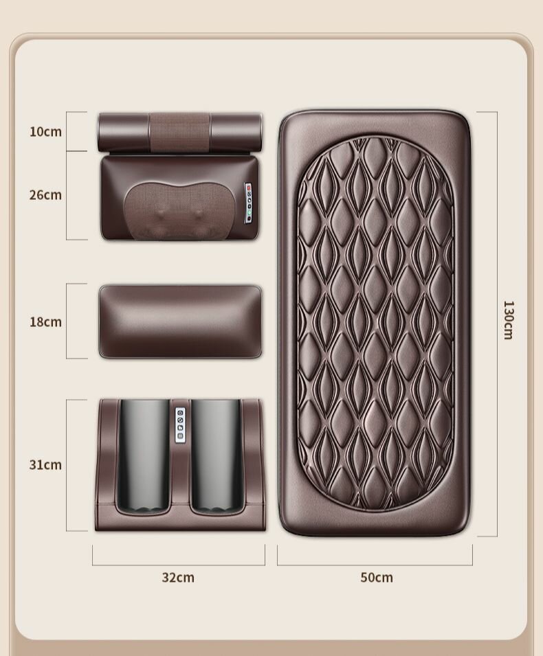 Ароматическая подушка валик; массажная подушка для шеи и плеч; массажный матрас с роликами; массажер для ног; пульт управления; инструкция на русском языке