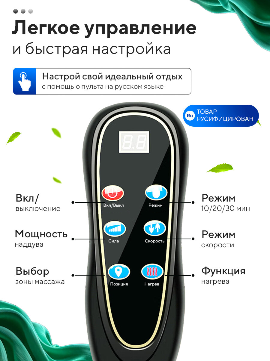 Матрас оснащен множеством зон массажа, включая спину, грудную клетку, ноги, бедра, голени, ягодицы, плечи, талию, руки и поясницу. Это позволяет охватить все основные группы мышц и обеспечить комплексный массаж.