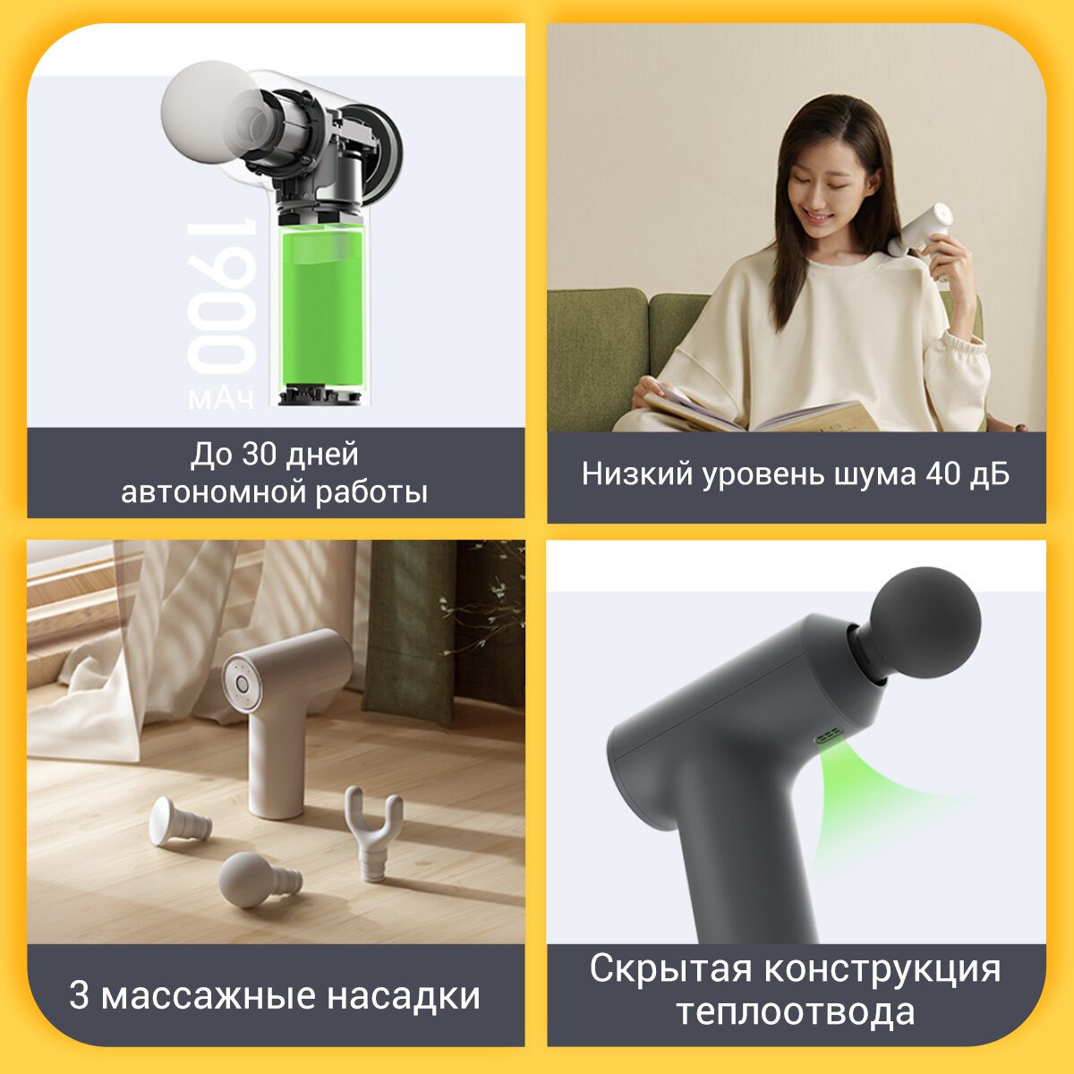 Общие характеристики - Тип: Массажный прибор - Бренд: Xiaomi - Зоны массажа: Ноги, Плечи, Руки, Ягодицы - Страна-изготовитель: Китай - Вид массажа: Вибрационный - Количество программ/режимов: 2 - Мощность массажера, Вт: 58 - Фактический размер товара, см: 10 x 13 x 4.5 мм - Материал корпуса: ABS пластик Описание Массажный пистолет Mijia Mini Fascia Gun 2C (MJJMQ03YM) Инновационный перкуссионный массажер имеет высокую функциональность и эффективность массажера. Он обладает достаточным давлением для тщательного массажа и разогрева мышц, имеет различные режимы работы и контроль мощности, при этом остается легким и компактным. Также его высокая скорость вращения и длительность работы аккумулятора обеспечивают эффективное использование продукта в течение продолжительного времени. Мощность до 12 кг Перкуссионный массажёр Mijia Mini Fascia Gun 2C обладает мощностью давления впечатляющих 12 кг, способных проникнуть глубоко в ткани, обеспечивая интенсивное оздоровление мышц и улучшение общего состояния. Высокоэффективный двигатель мощностью 58 Вт, обеспечивающий удивительную скорость вращения до 2500 оборотов в минуту, для максимального расслабления и стимуляции мышц. Глубокая релаксация 6 мм Уникальная функция релаксации на глубину до 6 мм, обеспечивающая интенсивную подготовку мышц перед тренировкой и снятие напряжения после нее. Уникальная система контроля мощности с помощью светового кольца на задней панели, предоставляющая возможность точно настроить силу и глубину массажа, достигая максимального комфорта. Режимы с фиксированной и переменной частотой. 3 режима на выбор для расслабления. Оба режима имеют по 3 уровня интенсивности, переключение с помощью двойного нажатия, обеспечивая более удобное управление и удовлетворяя различные потребности в разных ситуациях. Режим фиксированной частоты Массаж с постоянной скоростью для эффективного разжатия фасций, быстрое снятие мышечной боли после тренировок. Режим переменной частоты Плавное изменение частоты с высокой на низкую, смягчение напряженных мышц, ежедневное расслабление и снятие усталости. Индикатор силы для более безопасного контроля нажима Истинное расслабление достигается при оптимальной силе нажатия. Индикатор силы нажима* позволяет в реальном времени оценить степень давления, напоминая вам регулировать силу массажа, обеспечивая безопасность и эффективность каждого расслабления. - Если индикатор не светится — сила слабая, - Белый свет — средняя сила, - Оранжевый свет — большая сила. Интеллектуальное сохранение режимов Наслаждайтесь беззаботным расслаблением. Запомните свои предпочтения для массажа: при включении устройства автоматически выбирается последний использованный режим и интенсивность, не требуя постоянной настройки. Расслабление становится еще более беззаботным. Бесшумная работа Уровень шума всего 40 дБ, что позволяет наслаждаться тихим и комфортным массажем, не создавая дополнительного шума и внешних помех. Возможность настройки предыдущих настроек мощности, позволяющая повторить предыдущую настройку сеанса массажа для быстрого и удобного начала массажа без необходимости повторного настройки. Комплект насадок Умная технология, разработанная Xiaomi, обеспечивает надежность, безопасность и высокую производительность массажера, даря вам возможность наслаждаться расслабляющи