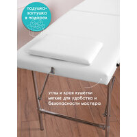 Складной массажный стол "Эконом мастер" фабрики Cosmotec, отличное решение для массажистов. Данная модель удобна в использовании как в стационарном варианте, в кабинете, так и в случае частых выездов к клиентам на дом. Для удобство контрукция массажного стола позволяет сложить его в виду чемоданчика. В сложеном состоянии размеры данной модели составляют всего 90х60х18 (ДлинахШиринахВысота). Благодаря прочному, но лёгкому каркасу из хромированной стали, вес массажного стола составляет всего 11 кг, и его удобно брать с собой. Вдобавок массажный стол оснащён анатомической пластиковой ручкой которая не рвётся и не натирает руку. Столешница массажного стола изготлвлена из прочной многослойной фанеры толщиной 6 мм. Материал обивки - высокачественная экокожа российского производства, устойчива к загряднениям и неприхотлива в уборке. Модель эконом мастер обладает вырезом для лица, прямыми углами и двойным слоем поролона. В комплекте к каждому столу прилагается заглушка для отверстия в форме подушки, которая позволяет использовать массажный стол в качестве косметологической кушетки, в том числе для таких процедур как: наращивание ресниц, перманентный макияж, шугаринг, эпиляция, хиджама, brow-процедуры и многое другое. В разложенном виде параметры массажного стола "Эконом мастер" - 180х60х75 (ДлинахШиринахВысота).