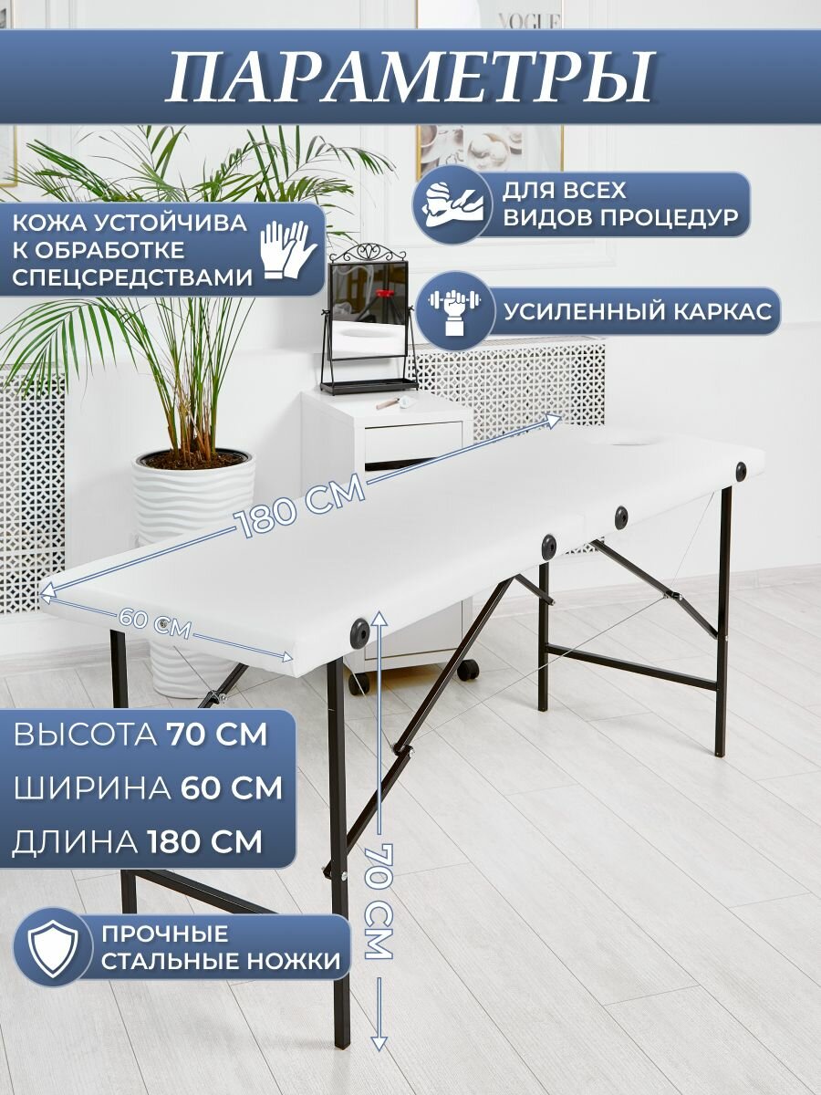 Массажный стол с вырезом для лица предназначен для всех видов массажа и других процедур. Параметры кушетки в разложенном виде: высота 70 см, ширина 60 см, длина 180 см. Нагрузка до 200 кг. В подарок вы получаете удобную заглушку для выреза. Параметры кушетки в сложенном виде: высота 60 см, длина 90 см, ширина 13 см. Вес изделия всего 11 кг. Ножки выполнены из стального профиля с заглушками для защиты покрытия, на котором устанавливается кушетка. Массажный стол сделан из искусственной кожи российских производителей, что позволит ей увеличить срок службы в отличие от аналогичных предложений. Кожа легко обрабатывается спецсредствами и имеет высокую плотность. Для наполнения используется листовой поролон средней жесткости, что позволяет сохранять ему форму. Кушетка легко складывается в переносной чемодан. Оснащен ножками, ручкой для переноски и заглушкой в комплекте. Для закрытия чемодана используется мягкий замок, который не цепляется за одежду. Массажные столы сертифицированы и соответствуют описанию в карточках товара. На производстве проходит многоуровневый контроль качества и используются только высококачественные материалы и фурнитура. Обивка и натяжка кушеток отличается высоким качеством и уникальной бесшовной технологией, которая защищает углы и дает более долгий срок службы изделия.