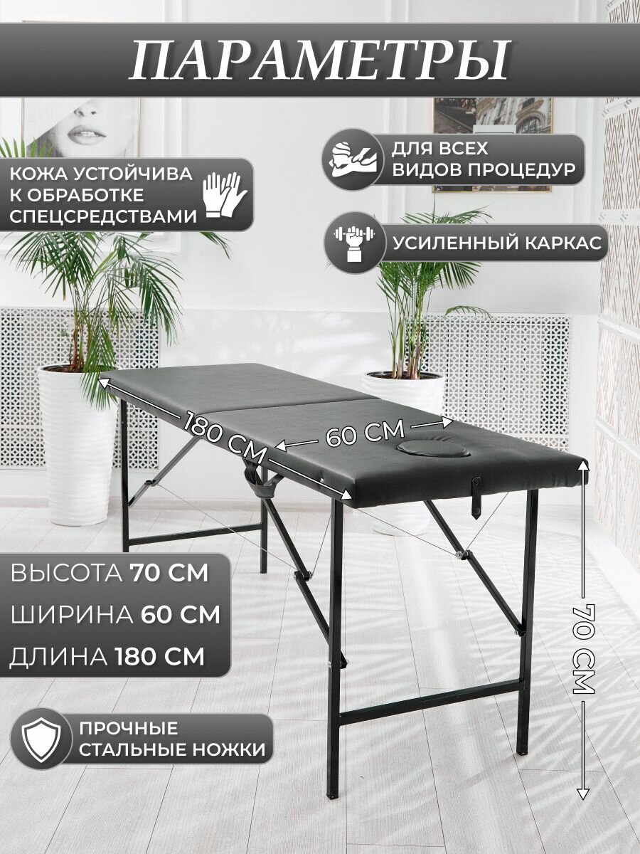 Массажный стол с вырезом для лица предназначен для всех видов массажа и других процедур. Параметры кушетки в разложенном виде: высота 70 см, ширина 60 см, длина 180 см. Нагрузка до 200 кг. В подарок вы получаете удобную заглушку для выреза. Параметры кушетки в сложенном виде: высота 60 см, длина 90 см, ширина 13 см. Вес изделия всего 11 кг. Ножки выполнены из стального профиля с заглушками для защиты покрытия, на котором устанавливается кушетка. Массажный стол сделан из искусственной кожи российских производителей, что позволит ей увеличить срок службы в отличие от аналогичных предложений. Кожа легко обрабатывается спецсредствами и имеет высокую плотность. Для наполнения используется листовой поролон средней жесткости, что позволяет сохранять ему форму. Кушетка легко складывается в переносной чемодан. Оснащен ножками, ручкой для переноски и заглушкой в комплекте. Для закрытия чемодана используется мягкий замок, который не цепляется за одежду. Массажные столы сертифицированы и соответствуют описанию в карточках товара. На производстве проходит многоуровневый контроль качества и используются только высококачественные материалы и фурнитура. Обивка и натяжка кушеток отличается высоким качеством и уникальной бесшовной технологией, которая защищает углы и дает более долгий срок службы изделия.