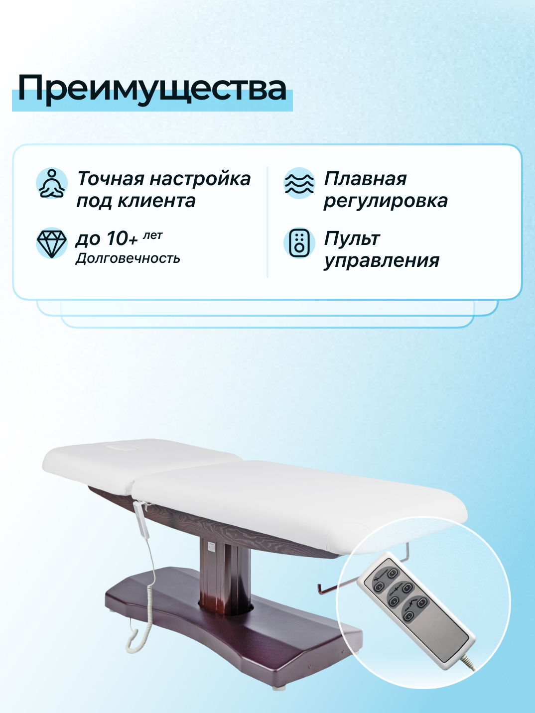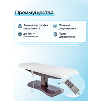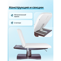 Основа кушетки металлическая, что обеспечивает прочность и стабильность конструкции, 2 электромотора позволяют легко регулировать высоту кушетки и угол наклона спины.