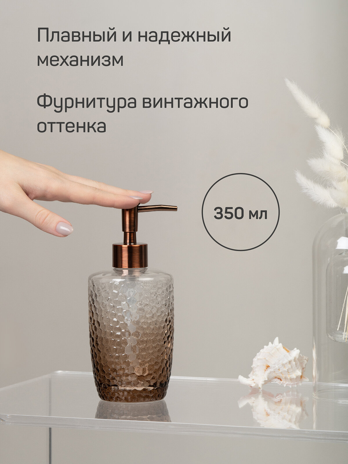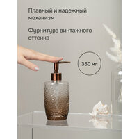 Дозатор для жидкого мыла VINTAGE объемом 350 мл оснащен экономичным механизмом подачи жидкого мыла. Фурнитура выполнена из пластика благородного бронзового цвета.