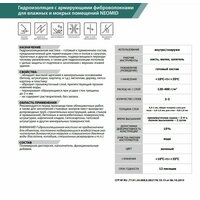 расход 0,5-1,7 кг/м²; выдерживает 5 циклов замораживания-оттаивания; пожаровзрывобезопасна; состав: связующее, инертный наполнитель, модифицирующие добавки