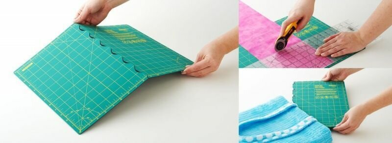 Коврик складывается пополам, что увеличивает удобство при хранении и транспортировке. При развороте складной шов обеспечивает прочную режущую поверхность.