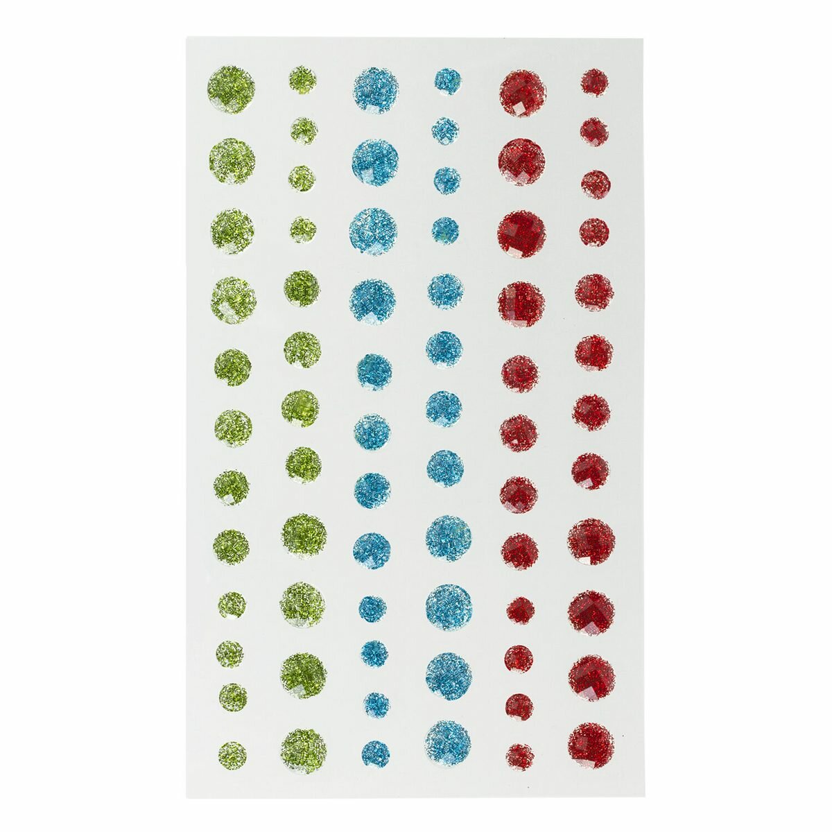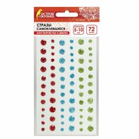 Самоклеящиеся круглые стразы диаметром 5 мм, 8 мм и 10 мм предназначены для украшения различных изделий. В упаковке содержится 72 страза 3 разных цветов - красный, голубой, зелёный. Благодаря наличию граней на поверхности, блестящие стразы сверкают и переливаются ещё сильнее. Стразы расположены на прозрачной подложке размером 9,5х15,5 см. Необходимо просто отклеить страз от подложки и поместить на выбранную поверхность. Благодаря качественному клеевому слою, стразы надёжно держатся на любых видах поверхности: бумага, картон, пластик, дерево и т. д.