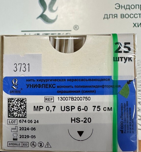 Продукция представлена официальным представителем завода-изготовителя Импортные эквиваленты: RESOPREN/ресопрен (Resorba), PRONOVA/пронова (Ethicon /Johnson&Johnson/), PROLENE/пролен (Ethicon /Johnson&Johnson/), Surgipro/Сургипро (Covidien /Medtronic/), SURGILENE/сургилен (TYCO), Premilene/Премилен (B.Braun), MOPYLEN/мопилен (Resorba). Описание: Медицинское изделие унифлекс – шовный хирургический стерильный нерассасывающийся поливинилиденфторидный монофиламентный материал. Преимущества: Мононити унифлекс прочны, не теряют прочность под действием тканевых жидкостей, отличаются высокой биосовместимостью, атравматичны, некапиллярны, нефитильны. Монолитная структура и гидрофобность предотвращают инфицирование шовного материала. Мононити унифлекс более гибкие, чем полипропиленовые мононити, вследствие чего характеризуются меньшим эффектом «памяти». Область применения: Хирургия, нейрохирургия, пластическая хирургия, торакальная хирургия, онкология, сердечно-сосудистая хирургия, офтальмология, урология, акушерство и гинекология. Показания: Мононити унифлекс рекомендованы для всех видов аппроксимации мягких тканей, для наложения съемных косметических внутрикожных швов, для фиксации различных имплантируемых устройств (герниопротезов, сосудистых протезов), для наложения лигатур. Противопоказания: Мононити унифлекс не рекомендованы для использования при операциях на органах мочевыделительной и желчевыделительной систем (риск камнеобразования). Применение: Мононити унифлекс применяются для фиксации различных имплантируемых устройств: при протезировании сосудов, имплантации сердечных клапанов, эндопротезов в герниопластике и урогинекологии, других органов и тканей, для наложения швов на апоневроз, кожу, сухожилия, поджелудочную железу, желудочно-кишечный тракт, для наложения съемных косметических внутрикожных швов, а также во всех случаях, требующих длительной фиксации краев операционной раны. Мононити легко вяжутся хирургическими узлами как с использованием стандартной мануальной техники завязывания, так и с помощью инструментов. Для надежной фиксации шва, выполненного мононитью, необходимо наложение дополнительных узлов. Стерилизация: Газовая – оксид этилена (ЕО). В случае повреждения стерильной упаковки медицинское изделие подлежит утилизации. Условия транспортирования: Всеми видами крытых транспортных средств в соответствии с правилами, действующими на каждом виде транспорта, при температуре от минус 50 °С до плюс 50 °С. Условия хранения: При температуре от плюс 5 °С до плюс 40 °С в месте, защищенном от влаги и прямых солнечных лучей. Не размещать вблизи источников тепла. Срок годности: При соблюдении условий хранения в упаковке производителя – 5 лет. Производитель: ООО «Линтекс», Россия. Регистрационное удостоверение медицинского изделия: № ФСР 2008/02206 от 30.06.2020г.