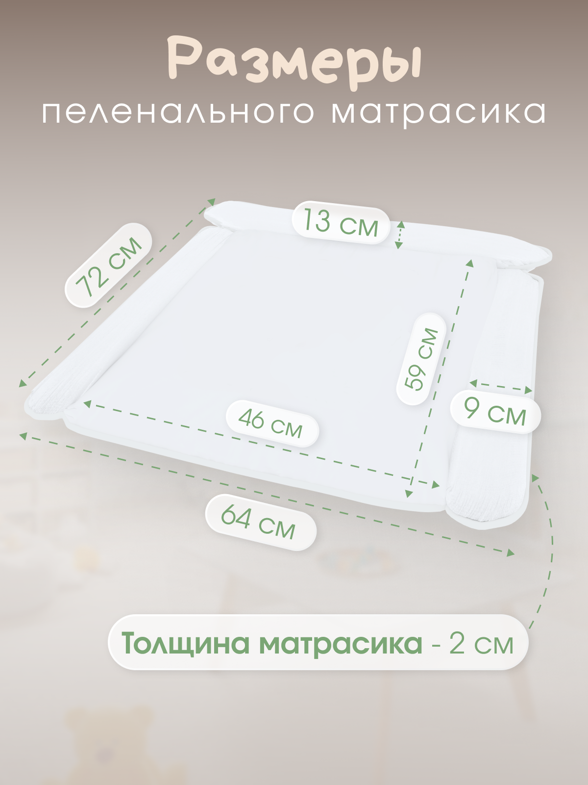 Матрас для пеленального столика универсальный – незаменимый помощник для пеленания, переодевания и гигиенических процедур вашего малыша. Матрасик на пеленальный столик имеет оптимальные размеры - 64*72 см, обеспечивающие достаточное пространство для комфорта малыша и удобства родителей. Универсальный матрас для пеленания подходит для пеленальных столов шириной от 46 см и глубиной от 59 см. Подходит для складных и нескладных пеленальных столиков. В комплекте с матрасиком 2 самоклеющиеся липучки против скольжения, которые мы рекомендуем клеить на основание комода. Матрас изготовлен из водонепроницаемой ткани DUSPO, которая гарантирует защиту от намокания и позволяет легко поддерживать матрас в чистоте. Главным преимуществом данной ткани является то, что при соприкасании отсутствует «эффект холодного прикосновения». Внутренний наполнитель детского матраса – это мягкий и гипоаллергенный синтепон, который обеспечивает комфорт и безопасность для нежной кожи вашего ребенка. Синтепон не вызывает аллергических реакций, не утрачивает своих свойств со временем и сохраняет свою форму даже после длительного использования. Важная особенность матрасика для пеленания - мягкие бортики, которые складываются с трех сторон, благодаря чему ребенок не ударится об стенки пеленальной доски. Матрасик изготовлен с учетом всех требований безопасности и гигиены. Он не содержит токсичных запахов и испарений, что делает его абсолютно безопасным для новорожденных. Благодаря гипоаллергенным свойствам, он идеально подходит для детей с чувствительной кожей. Подкладка на пеленальный стол – это не просто элемент детского уюта, это надежный помощник для родителей, обеспечивающий безопасные и комфортные условия для ухода за младенцем. Высокое качество материалов, продуманный дизайн и легкость в уходе делают его идеальным выбором для каждого родителя.