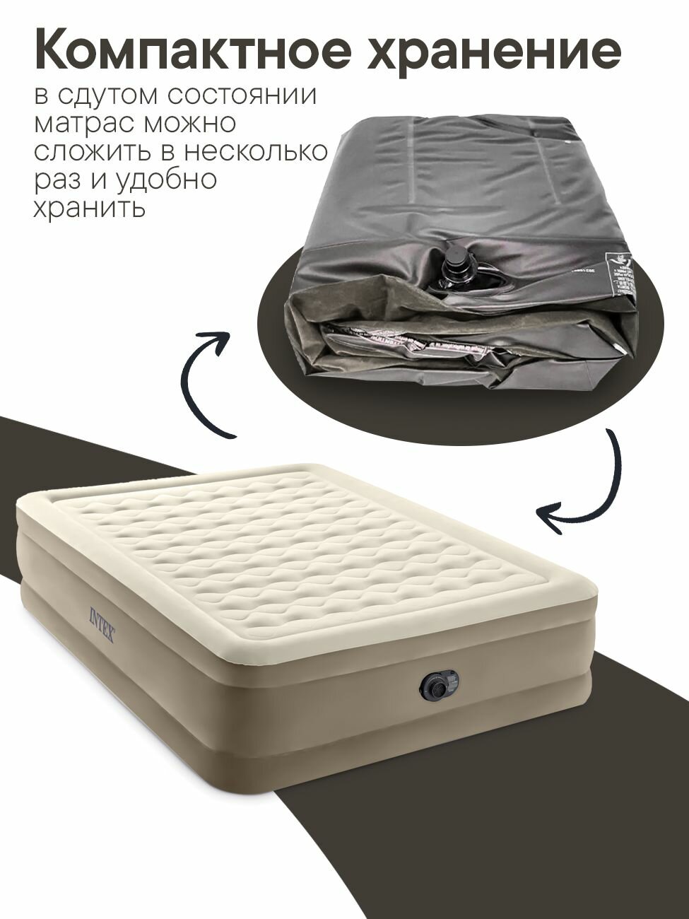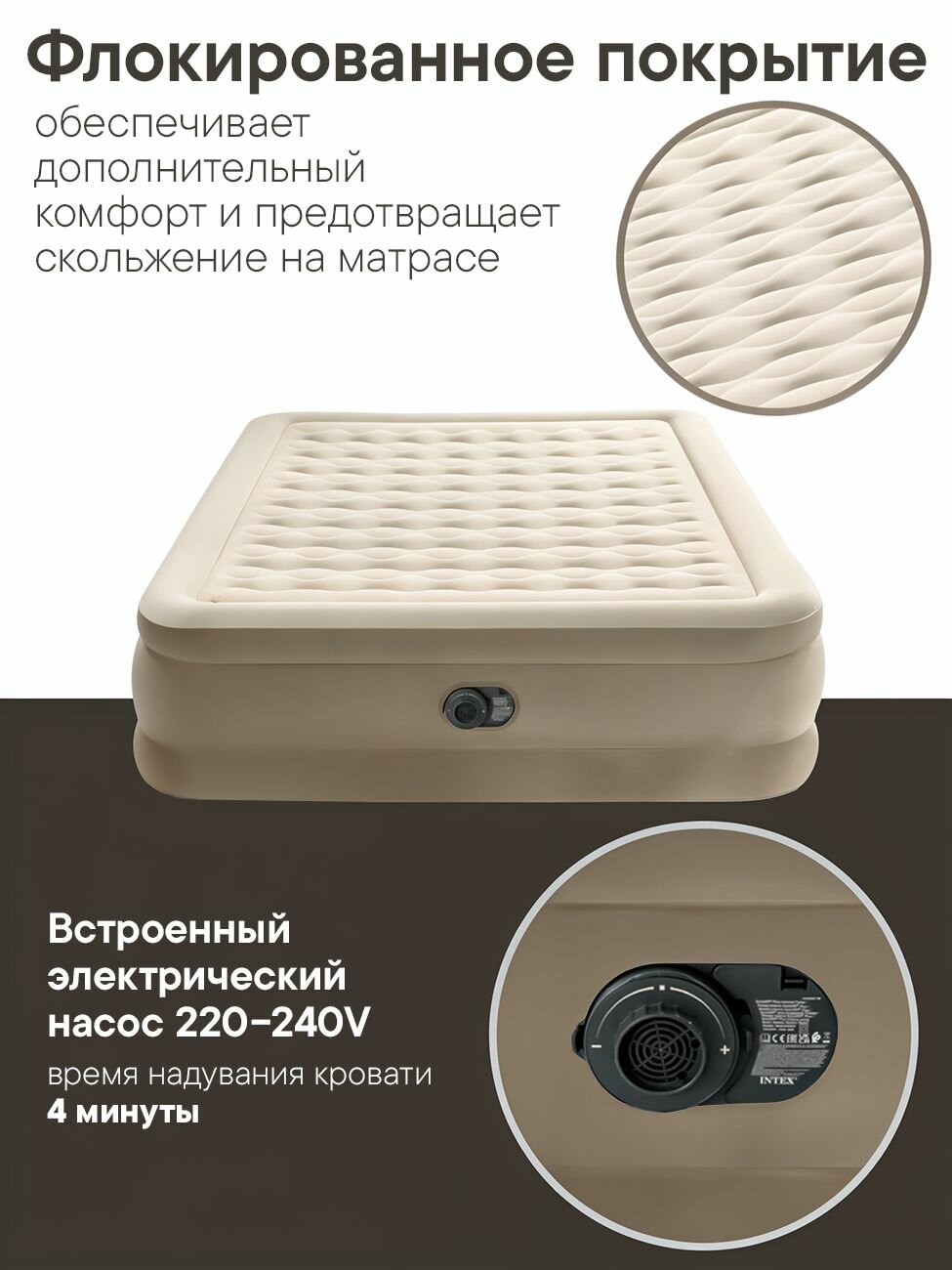 - Встроенный электрический насос 220-240V: быстро и бесшумно надувает кровать матрас за 4 минуты.