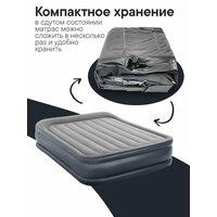 Этот надувной двуспальный матрас создан для комфортного сна дома, на даче или в поездке. Верхняя часть выполнена в стильном сером цвете с флокированной поверхностью, напоминающей бархат. Она не только приятна на ощупь, но и обеспечивает надежное удержание постельного белья.