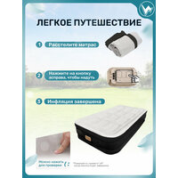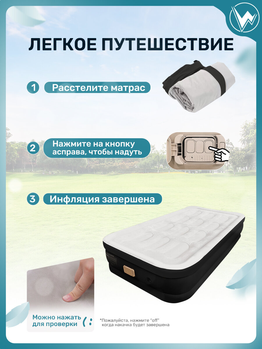 1. Кровать изготовлена из материала ПВХ высокой плотности, который обладает хорошей эластичностью и прочностью, выдерживает большие ударные нагрузки и не так легко лопается. 2. Флокированное покрытие не даёт соскальзывать белью, и в тоже время легко чистится. 3. Встроенный электронасос позволяет быстро надувать и сдувать кровать и даёт возможность отрегулировать её упругость. При отсутствии электричества, кровать можно накачать механическим насосом. 4. Удобная поверхность для сна: Мягкий ворсистый верх обеспечивает повышенный комфорт и устойчивость. 5. Портативная конструкция: Компактное хранение и удобство переноски.