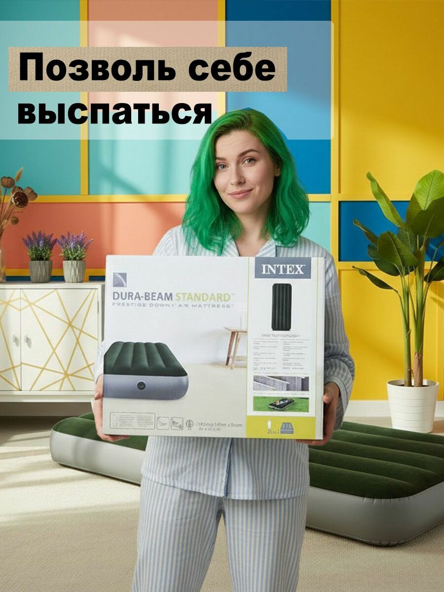 Intex 64106 Надувной односпальный матрас 76х191х25см "Prestige", нагрузка до 136кг. Матрас для палатки подойдет туристу и походнику, в горы или в лес, рекомендуется спать с пенкой, чтобы было теплее. Идеально сочетает в себе стильный дизайн и максимальное удобство. Он выполнен по запатентованной технологии Fiber-Tech: перегородки внутренней конструкции состоят из тысяч полиэфирных волокон, благодаря чему эта модель имеет высокую прочность, надолго сохраняет форму и не проминается. Ворсистая велюровая поверхность приятна на ощупь, легко чистится и моется, не пропускает влагу, предотвращает сползание постельного белья. Надувной матрац Интекс прекрасно подойдет для отдыха дома , на даче или открытом воздухе , для гостей. Размер матраса 191х76х25 см. Дополнительная комплектация - ручной насос Intex. Удобный легкий насос 68612 Intex подходит для надувания матрасов, кроватей, лодок. Благодаря наличию насадок также используется с небольшими изделиями : мячами , кругами. Как и все ручные насосы имеет принцип двойного действия - качает при движении ручки в обе стороны и вверх и вниз. Внимание! Если Вы приобрели надувное изделие в зимнее время года, то НИ В коем случае не доставайте его сразу из коробки. Поставьте в теплое место, желательно возле батареи на 2 – 3 часа. Только после этого извлеките товар из коробки. Убедитесь, что материал стал мягким и накачайте на 80 %. Изделие примет форму, складки разгладятся, через час можно накачать полностью.