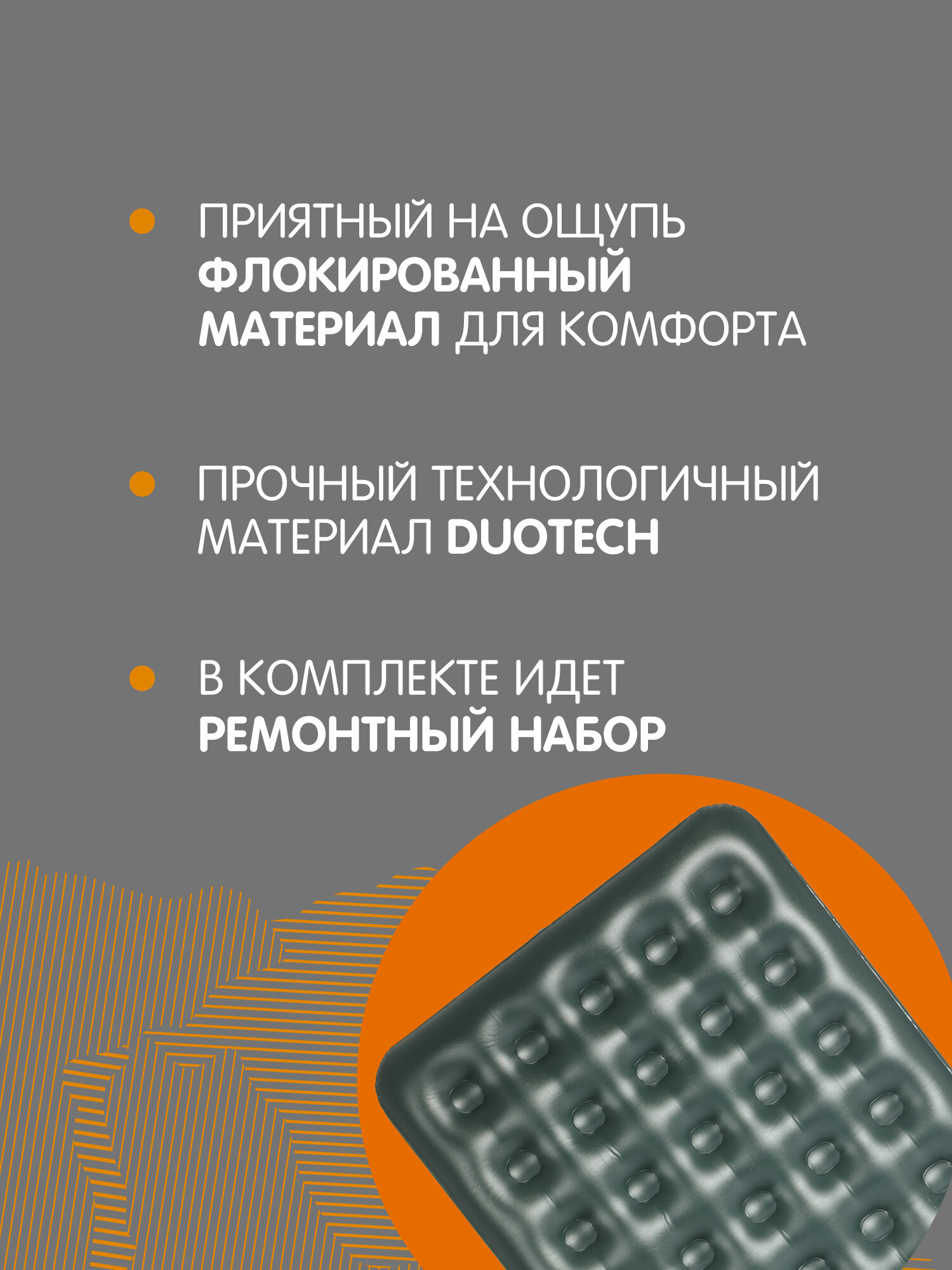 Матрас Outventure изготовлен из прочного и технологичного материала Duotech, который гарантирует долгий срок службы изделия даже при интенсивной эксплуатации на открытом воздухе. Он устойчив к проколам и повреждениям, что делает его надежным решением для кемпинга и отдыха на природе. В комплекте с матрасом идет ремонтный набор, который, в случае непредвиденных ситуаций, позволит быстро устранить мелкие повреждения и продолжить использование. Этот матрас сочетает в себе удобство, надежность и практичность, делая его незаменимым спутником для любителей активного отдыха на свежем воздухе.
