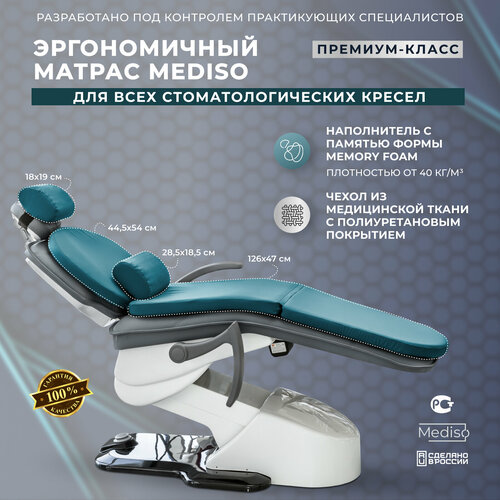 Матрас с памятью формы рекомендуется для установки на стоматологические кресла с эстетической целью и для обеспечения пациенту повышенного комфорта во время проведения длительных стоматологических процедур. Съемный чехол из высококачественной медицинской ткани с полиуретановым покрытием. Подходит для любых стоматологических кресел. В комплекте идет подголовник и поясничный валик. Размеры элементов: Элемент 1: Спинка– 43см х 54,5см; сиденье – 124см х 46,5см (сужение в нижней части до 42см); Элемент 2: Подголовник – 18см х 19см; Элемент 3: Поясничный валик – 28,5см х 18,5см. Гарантия 1 год. Изготовлено в России.