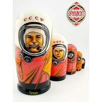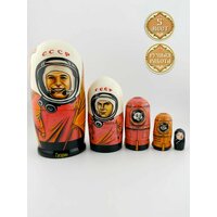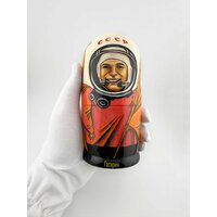 Матрёшка "Первый космонавт" посвящена первым полётам в космос. Космонавты Гагарин и Титов, Белка и Лайка и спутник. Профессиональная ручная роспись темперными, акриловыми и акварельными красками. Высокая детализация. Основа выточена на станке из древесины липы. Финишная обработка – 3 слоя нетоксичного лака. Так как это ручная работа, возможны незначительные отличия от картинки. Игрушка состоит из 5 частей, а высота — 15 см (возможна погрешность размера в зависимости от заготовки).