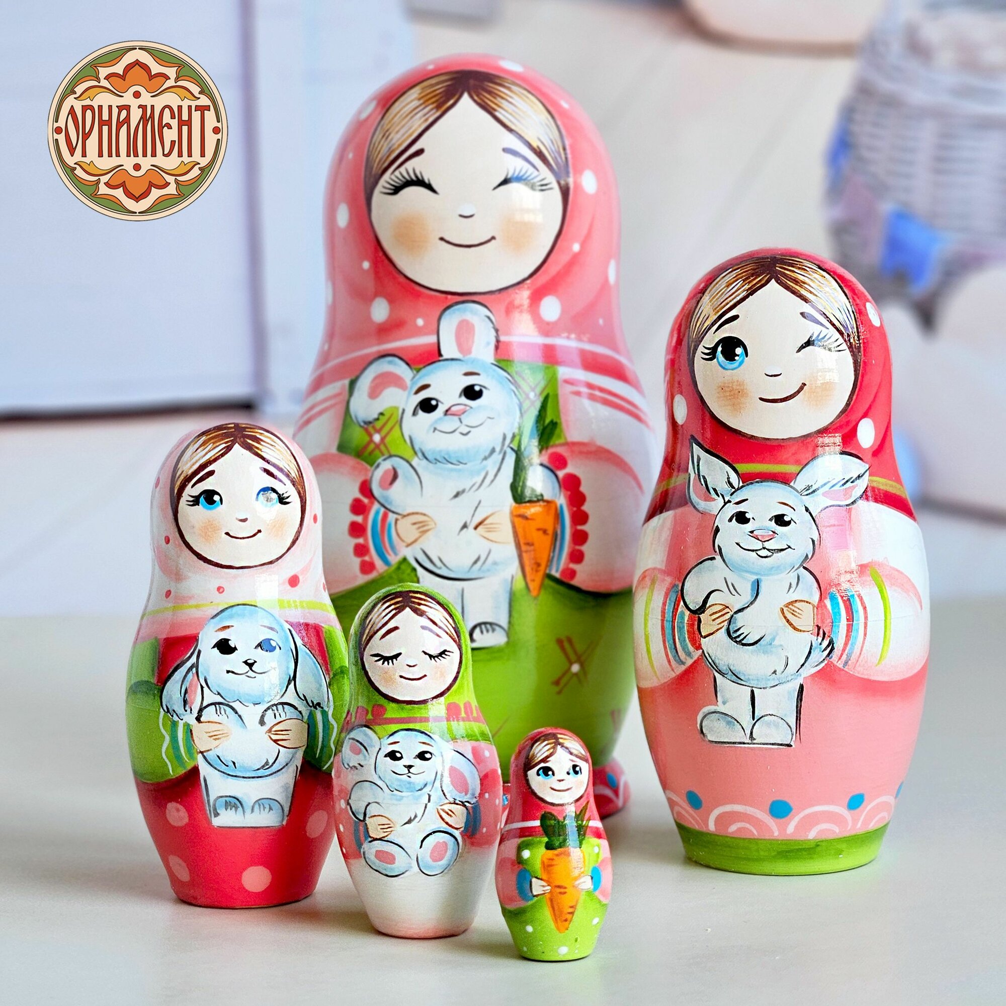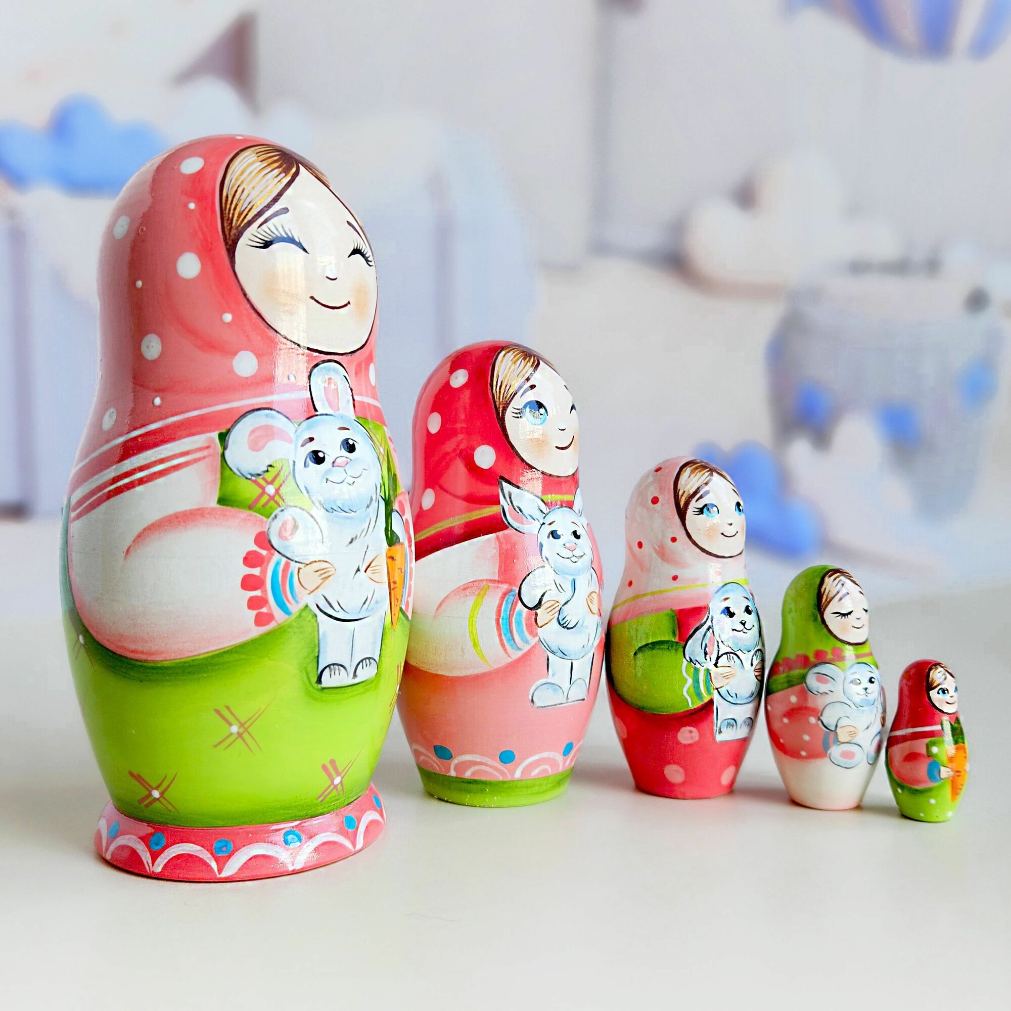 Матрешка "Зайки". Очень хорошего качества, красивое открытое лицо, качественная яркая роспись. Каждая матрешка с разным выражением лица. Матрешка изготовлена из хорошо просушенного дерева и покрыта трехслойным глянцевым лаком. Послужит отличным подарком в русском стиле. br/>