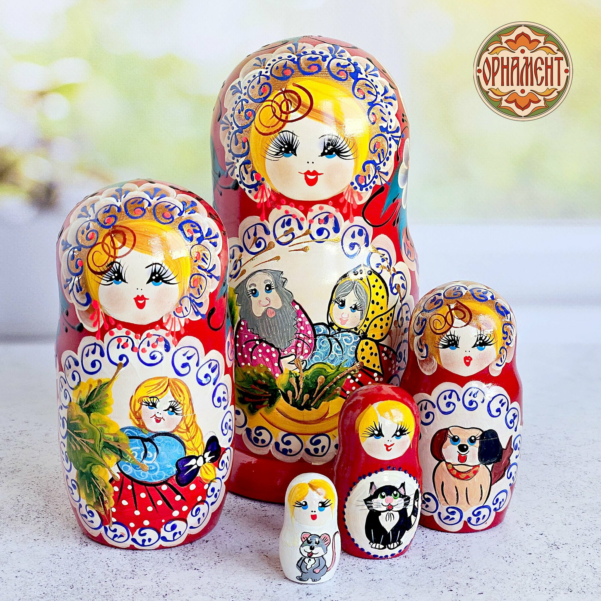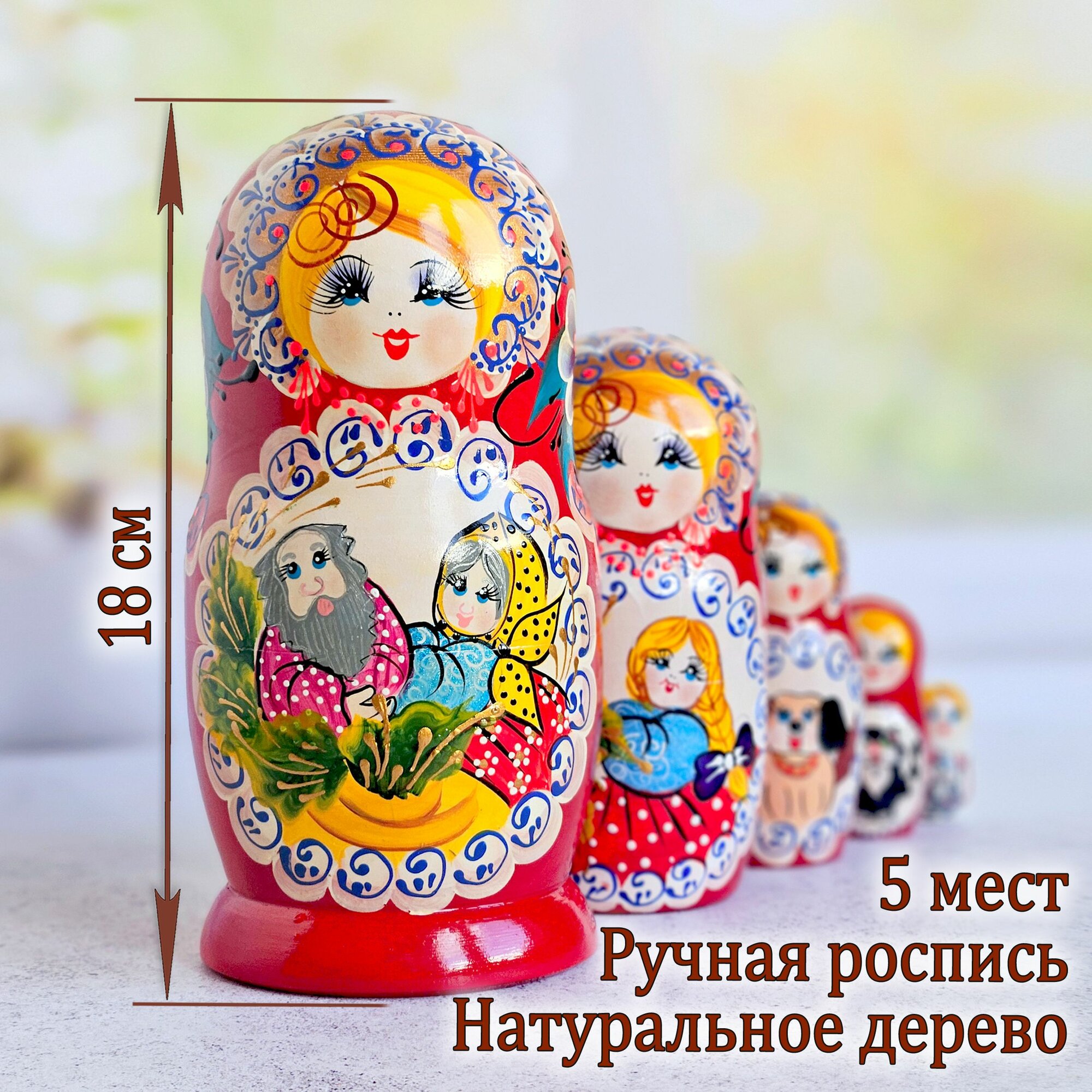 Матрешка ручной работы расписана в традиционном стиле. Русская народная сказка Репка порадует вашего ребенка. Послужит хорошим наглядным пособием к сказке. Покрыта глянцевым лаком. Высота первой, самой большой матрешки - 18 см!