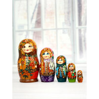 Матрешка сезоны. Сезон зима. На каждой матрешке изображены все сезоны, последняя пятая повторяет первую матрешку, символизируя круг времени. Классическая русская матрешка ручной работы. Матрешка покрыта лаком.