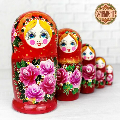 Очень милая и качественно расписанная русская матрешка профессиональным художником мастерской "Орнамент". Русская кукла покрыта глянцевым лаком. Деревянная заготовка. Игрушка сделана в России и состоит из 5 частей, сама матрешка высотой в 18 см. Так как это полностью ручная работа, могут быть незначительные отличия от картинки. Это изделие народных художественных промыслов может украсить интерьер и стать отличным подарком в русском стиле. Кукла выточена из древесины липы и с любовью расписана в традиционном стиле нашими художниками. Вы ищете уникальный и оригинальный подарок для своих близких и друзей? Мы предлагаем вам наши красивые и уникальные матрешки - классический русский сувенир, который понравится каждому. Мы используем только высококачественные материалы, чтобы наши матрешки были не только красивыми, но и долговечными. Приобретая наши матрешки, вы можете быть уверены, что получите продукт высокого качества. Мы тщательно следим за тем, чтобы каждый экземпляр был безупречным и отвечал нашим высоким стандартам. Мы гарантируем, что наши матрешки будут служить вам долгое время и будут радовать вас своей красотой и оригинальностью. Изделие изготовлено при четком соблюдении всех необходимых технологий и покрыто не токсичным лаком.