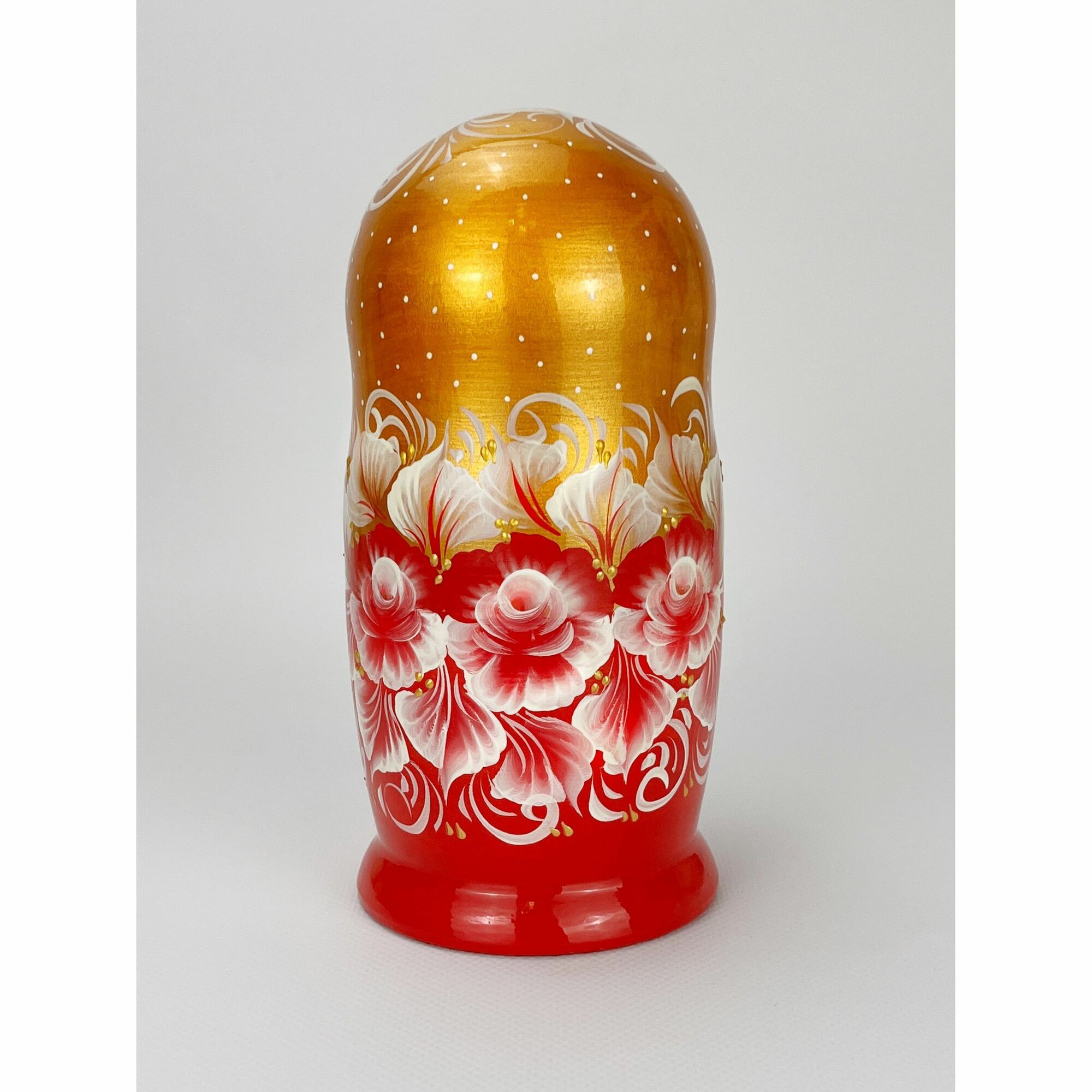 Перед вами очень красивая матрешка большого размера - 18 см. Художник изящно сочетал три цвета: красный, белый и золотой, рисунок выпоснен в классическом русском стиле. Красивое лицо с ажурным золотым кокошником. Матрешка покрыта глянцевым лаком. Послужит отличным подарком и украсит любой интерьер. br/>