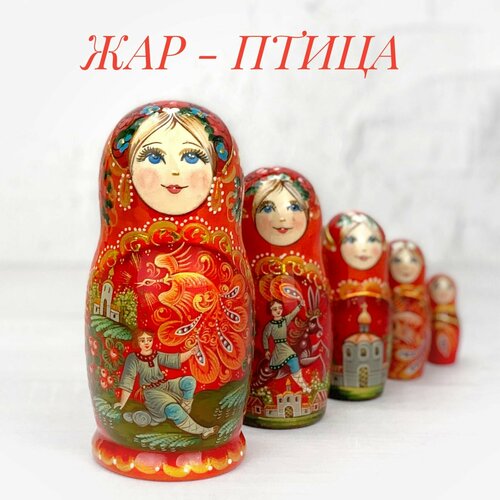 Авторская матрешка, разработка нашей мастерской "Орнамент". На матрёшке изображены сюжеты из русской сказки "Жар -Птица". Матрешка выполнена в ярких традиционных красных тонах. Качественная ручная роспись. Матрешка покрыта трехслойным глянцевым лаком. Хотите удивить своих друзей или родственников? Подарите им одну из наших деревянных красавиц! Матрёшки авторские ручной работы поэтому возможны незначительные отличия. Вы ищете уникальный и оригинальный подарок для своих близких и друзей? Мы предлагаем вам наши красивые и уникальные матрешки - классический русский сувенир, который понравится каждому. Наша коллекция матрешек включает в себя различные дизайны и размеры, чтобы удовлетворить любой вкус и бюджет. Мы используем только высококачественные материалы, чтобы наши матрешки были не только красивыми, но и долговечными. Матрешки - это не только прекрасный сувенир, но и отличный способ украсить ваш дом. Вы можете использовать их как элемент декора на полке, на столе или на комоде. Кроме того, наши матрешки могут стать прекрасным подарком на любой праздник - от дня рождения до свадьбы. Закажите сейчас наши матрешки и получите уникальный и оригинальный подарок, который будет радовать вас и ваших близких на протяжении многих лет. Приобретая наши матрешки, вы можете быть уверены, что получите продукт высокого качества. Мы тщательно следим за тем, чтобы каждый экземпляр был безупречным и отвечал нашим высоким стандартам. Мы гарантируем, что наши матрешки будут служить вам долгое время и будут радовать вас своей красотой и оригинальностью. Закажите наши матрешки прямо сейчас и получите возможность удивить своих близких уникальным подарком, который они будут помнить на долгие годы. Матрешек делают преимущественно из дерева мягкой породы - липы, это полностью ручная работа. Сушат бревна в течение нескольких лет, при хорошей вентиляции. Внимательно следят за качеством сушки древесины – она должна быть не сырой и не сухой. Начинают изготовление с самой последней неразборной фигурки. Последующие заготовки распиливают на две части, удаляют лишнюю древесину, чтобы элемент меньшего размера плотно держался внутри большого. Каждую матрешечку полируют, грунтуют, а затем раскрашивают. Далее детали покрывают масляным лаком и сушат. Чаще всего встречаются матрешки 5 мест и 10 мест. Сюжеты могут быть самые разнообразные - это и сказки, различные животные, политики, авангардная роспись, ну и конечно множество вариантов традиционных русских народных узоров. Матрёшка – отличная детская развивающая игрушка, которая приносит немало пользы для малыша. Как и сортер развивает мелкую моторику рук, ребенок учится сравнивать фигуры по высоте, размеру, цвету, объему, развивая мышление и логику. Выполненные из дерева фигурки помогают малышам познавать мир в тактильных и зрительных ощущениях. Расписная кукла будет полезным подарком для маленьких детей. Сейчас матрёшка – это известный на весь мир традиционный сувенир ручной работы из России. Такому подарку обрадуются не только гости из других городов, таких как Москва или Санкт-Петербург, русская деревянная матрешка может послужить как статуэтка и декор для дома на новоселье, подарочный набор для мальчиков и девочек, необычный подарок на Новый год, Рождество, Пасху, День рождения или Юбилей.