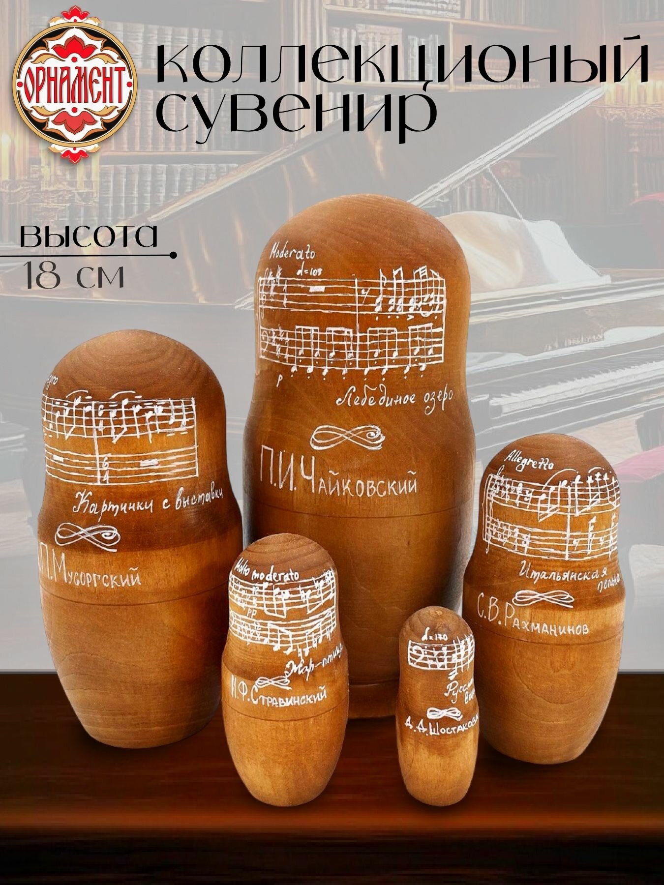 Матрешка деревянная русские композиторы Чайковский, Мусоргский, Рахманинов, Стравинский, Шостакович. Русский сувенир 5 мест 18 см Орнамент: сравнение цен, характеристики, фото, актуальное наличие и цены.