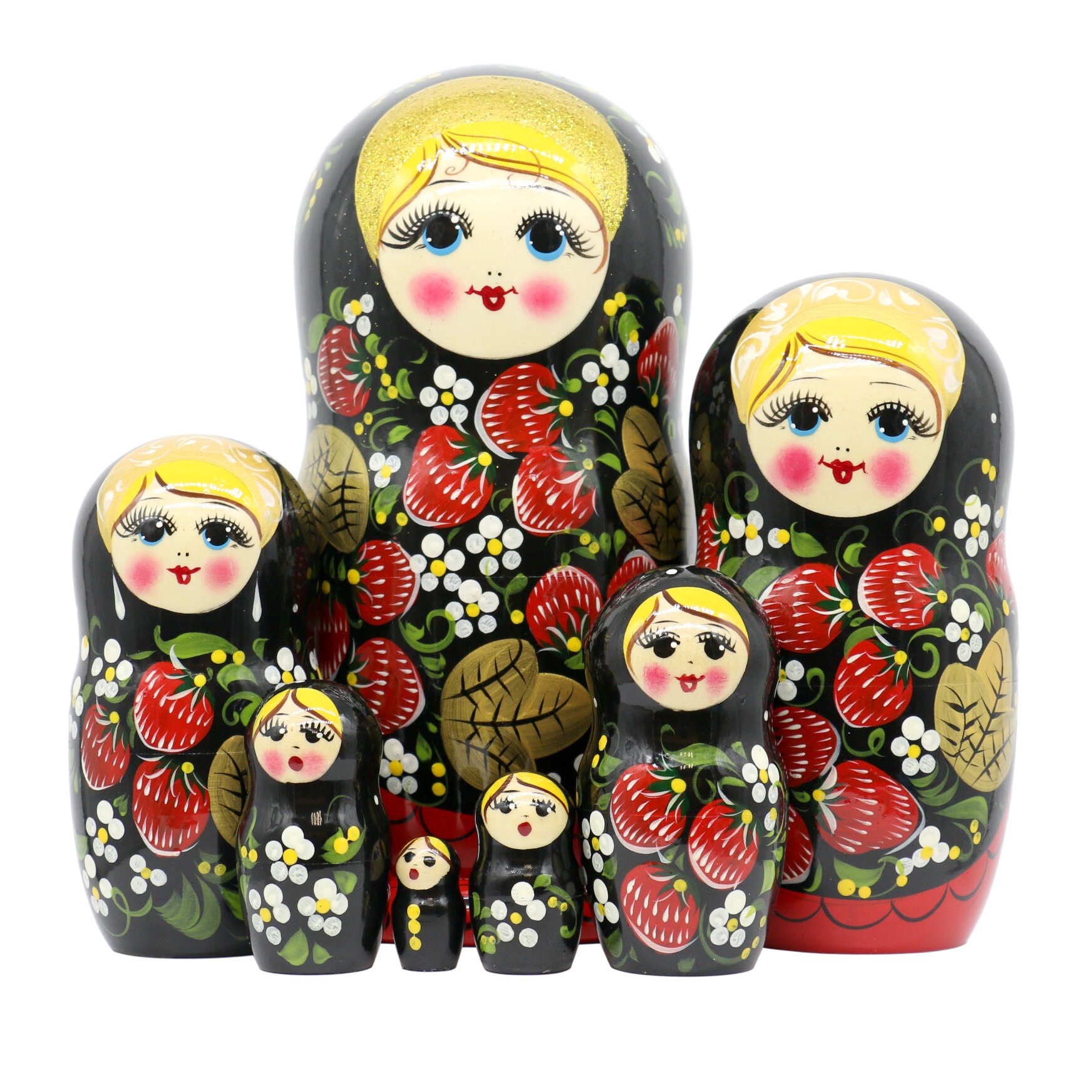 Матрешка Хохлома с клубникой изготовлена из качественных материалов, что гарантирует ее долговечность и безопасность для детей.