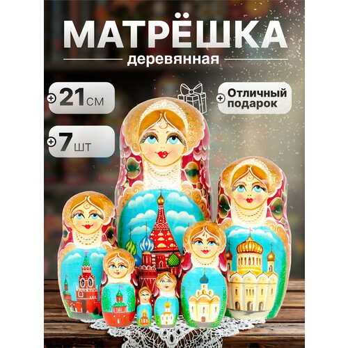 Матрешка выполнена в виде семи кукол, каждая из которых меньше предыдущей. Это позволяет не только увидеть все семь видов Москвы, но и рассмотреть их в деталях. Высота матрешки составляет 21 см, что делает ее удобной для хранения и использования.