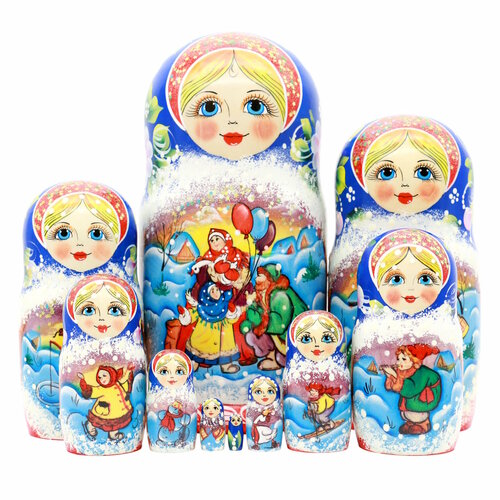 Матрешка выполнена в виде 10-местной игрушки, каждая из которых меньше предыдущей. Это позволяет не только увидеть, как менялся образ русской матрешки на протяжении веков, но и создает ощущение праздника и радости.