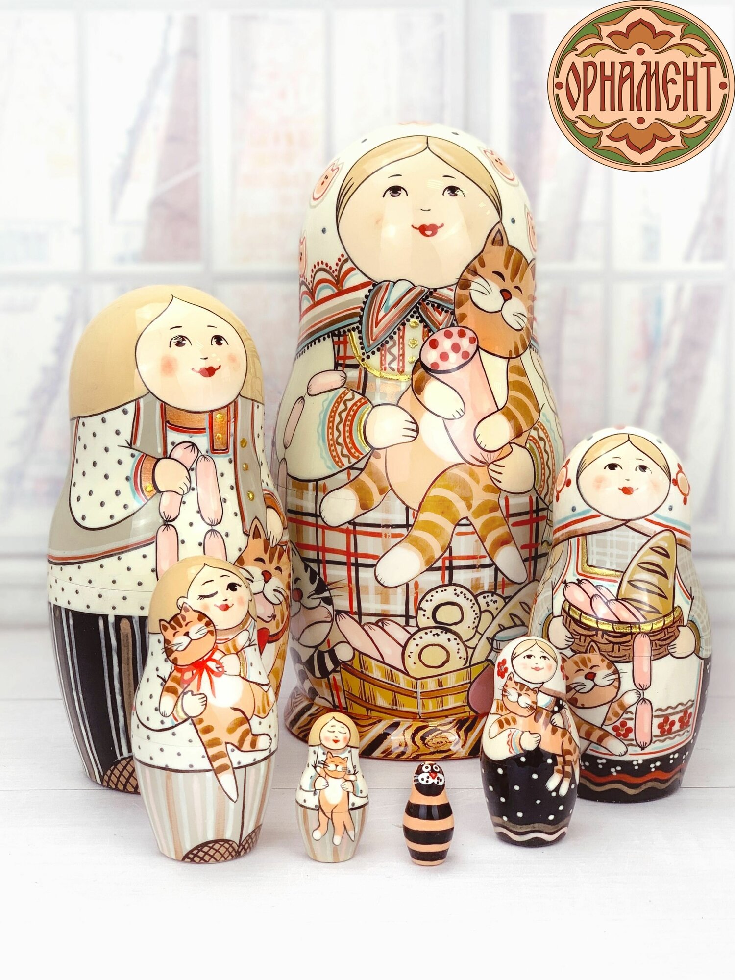Матрёшка ручной работы, нарисованная по образцу первой, созданной ещё в конце XIX века. Высокое качество росписи, финишное покрытие - фирменный высококачественный лак (4 слоя). Декорирована золотой поталью. Все матрёшки ручной работы, поэтому возможны несущественные различия. Высота первой - 21 см. Матрёшки ручной работы, поэтому могут быть незначительные изменения. Матрешек делают преимущественно из дерева мягкой породы - липы, это полностью ручная работа. Сушат бревна в течение нескольких лет, при хорошей вентиляции. Внимательно следят за качеством сушки древесины – она должна быть не сырой и не сухой. Начинают изготовление с самой последней неразборной фигурки. Последующие заготовки распиливают на две части, удаляют лишнюю древесину, чтобы элемент меньшего размера плотно держался внутри большого. Каждую матрешечку полируют, грунтуют, а затем раскрашивают. Далее детали покрывают масляным лаком и сушат. Чаще всего встречаются авторские матрешки 5 мест и 10 мест. Сюжеты могут быть самые разнообразные - это и сказки, различные животные, политики, авангардная роспись, ну и конечно множество вариантов традиционных русских народных узоров. Матрёшка – отличная детская развивающая игрушка, которая приносит немало пользы для малыша. Как и сортер развивает мелкую моторику рук, ребенок учится сравнивать фигуры по высоте, размеру, цвету, объему, развивая мышление и логику. Выполненные из дерева фигурки помогают малышам познавать мир в тактильных и зрительных ощущениях. Расписная кукла будет полезным подарком для маленьких детей. Сейчас это известный на весь мир народный традиционный сувенир из России. Такому подарку обрадуются не только гости из других городов, таких как Москва или Санкт-Петербург, русская деревянная матрешка может послужить как статутка и декор для дома на новоселье, подарочный набор для мальчиков и девочек, доктору, медработнику, необычный подарок на Новый год, Рождество, Пасху, День рождения, 8 марта или Юбилей.