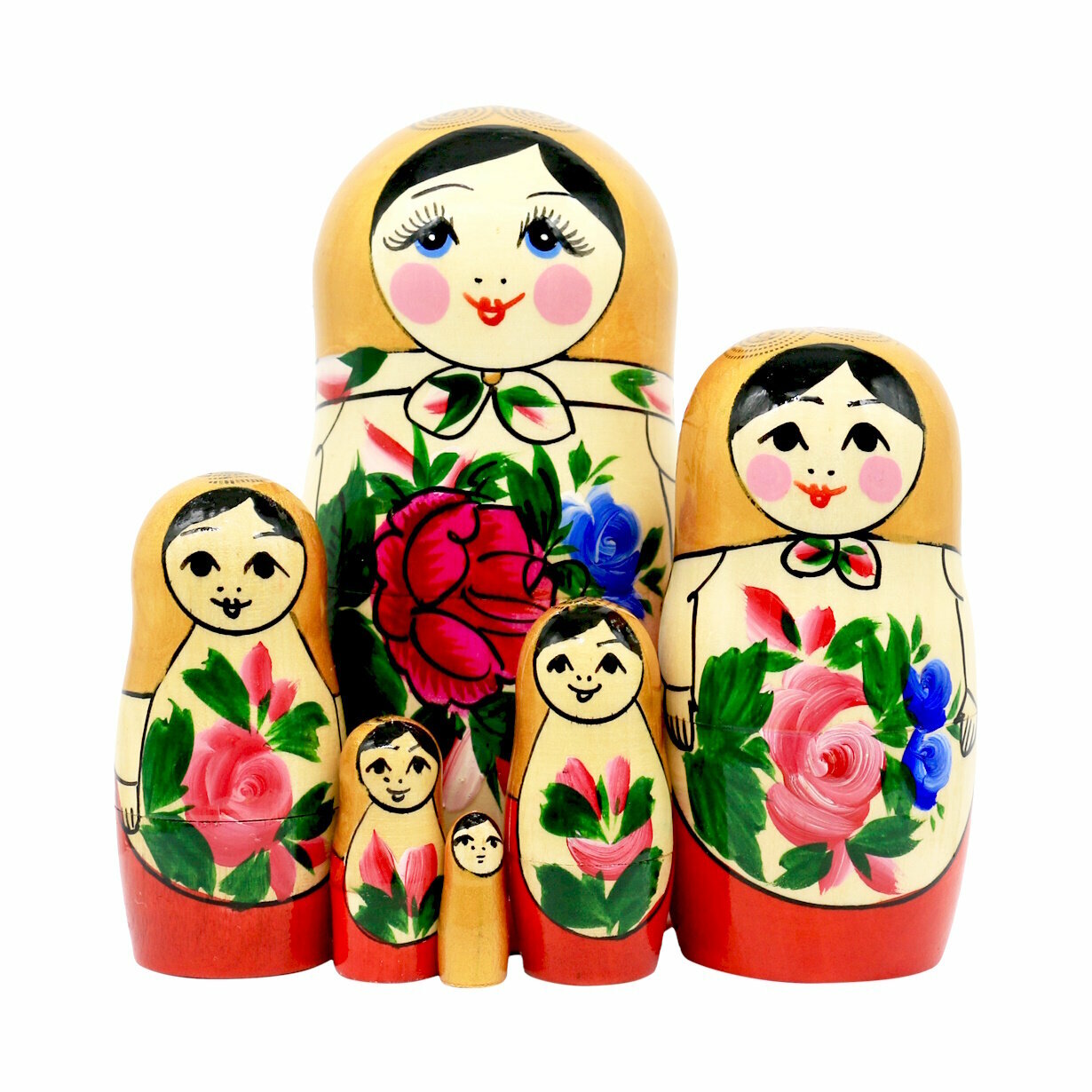 Матрешка Семеновская представляет собой разборную золотую матрешку, состоящую из 6 кукол высотой 14 см каждая.