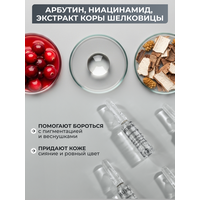 В состав входят вещества, которые деликатно отбеливают кожу, осветляют пигментные пятна, укрепляют капилляры. Эффект заметен после первого сеанса. При регулярном проведении лицо обретет ровный тон и сияние. Кроме осветляющего эффекта, сыворотка увлажняет и питает дерму.