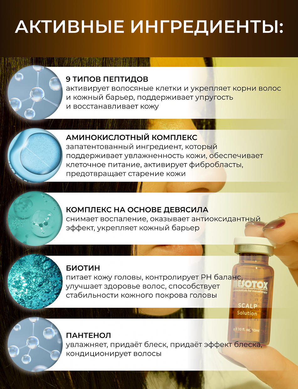 Мезотокс - премиальная ампула, содержащая запатентованные ингредиенты. 9 видов пептидов, аминокислотный комплекс, биотин и пантенол помогают сохранить здоровье ослабленной кожи головы, обеспечивая ее высококонцентрированным питанием.