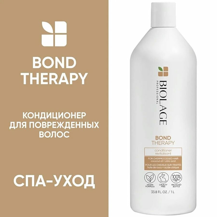 Профессиональный кондиционер для поврежденных волос Biolage Bond Therapy (Биолаж Бонд Терапи), 250 мл. Восстанавливающий кондиционер биолаж бонд терапи для глубокого восстановления волос при регулярном использовании разглаживает, питает и укрепляет волосы, делая их более послушными. Веган-формула кондиционера с лимонной кислотой и маслом кокоса помогает сделать волосы в 16 раз более восстановленными, без утяжеления*, в 3 раза менее ломкими уже после первого применения*.