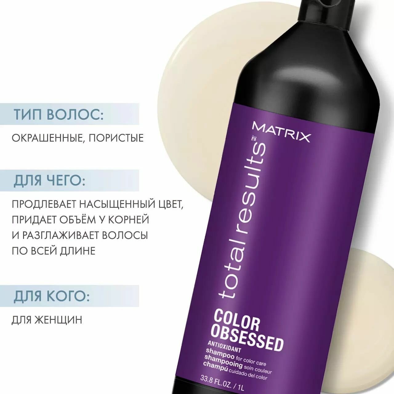 | Дополнительная информация | Шампунь для окрашенных волос Color Obsessed (Колор Обсэссд) с антиоксидантами защищает от выцветания и сохраняет насыщенность цвета окрашенных волос. Надолго придает пористым волосам гладкость, насыщенность цвета и блеск. При использовании системы из шампуня, кондиционера и спрея. Шампунь для окрашенных волос от Matrix Total Results обладает мягким и глубоким очищающим действием, придает блеск и надолго сохраняет цвет Ваших волос. Средство содержит специальные компоненты, которые восстанавливают пористые участки волосяных волокон, делают их мягкими и гладкими. Шампунь укрепляет кутикулу волоса, защищает от воздействия ультрафиолетового излучения и свободных радикалов. |