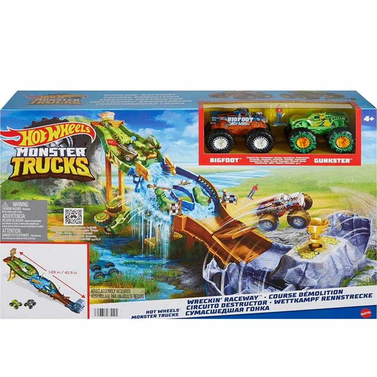 Купить Mattel Hot Wheels Monster Trucks Wreckin’Raceway/ Гоночная трасса Wreckin’ с снежным человеком и гангстером с доставкой по всей России.