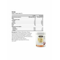 содержание на 100 г: L-лейцин - 42,9 г, L-изолейцин - 21,4 г, L-валин - 21,4 г; размер порции в г(мл): 7; назначение: поддерживает набор мышечной массы и восстановление мышц; рекомендации по применению: для получения 1 порции смешайте 1 мерную ложку порошка (7 г) с 250 мл воды; состав: L-лейцин, L-изолейцин, L-валин, яблочная кислота (регулятор кислотности Е330), сукралоза (подсластитель Е955), фосфат калия (эмульгатор Е340), ароматизатор, силикат кальция (агент антислеживающий Е552), подсолнечный лецитин (эмульгатор Е322), ацесульфам калия (подсластитель Е950), краситель красный FD&C №40 (краситель Е129)