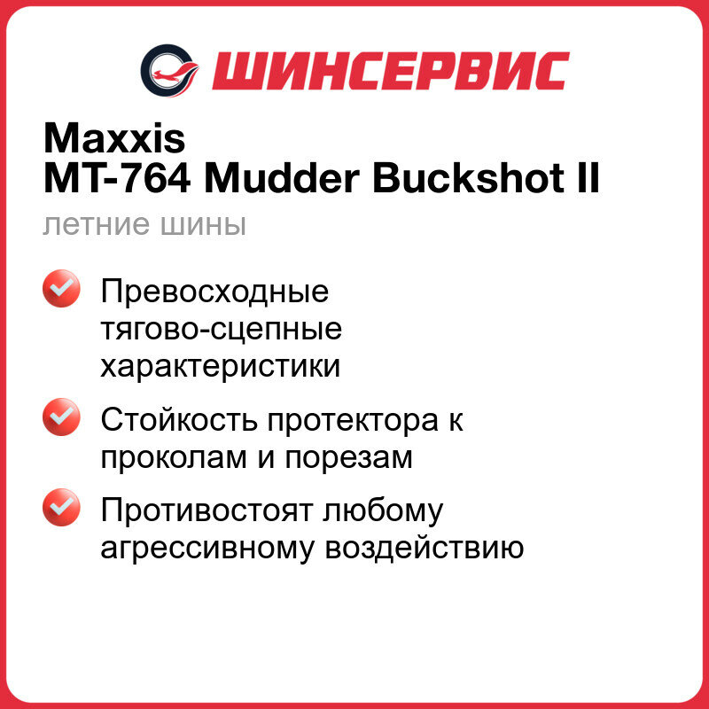 Всесезонная легковая шина Maxxis MT-764 Bighorn является очередным успешным шагом известного тайваньского производителя в направлении создания идеальной грязевой шины. Одной из отличительных особенностей данной модели является наличие широкого размерного ряда, представленным двумя десятками типоразмеров от 15 до 18 дюймов. Это позволяет оснастить данной узкоспециализированной шиной большинство легковых автомобилей повышенной проходимости. Как и полагается шине, предназначенной для передвижения по неустойчивым грунтам, протектор этой модели оснащен множеством массивных и высоких блоков. Все протекторные блоки сгруппированы в четыре продольных ребра, два из которых расположены в центральной части. Конфигурация протекторных блоков отличается большим количеством углом и острых граней. Это позволило обеспечить шине прекрасное сцепление с различными типами поверхности, в том числе и на каменистых грунтах. Еще одной особенностью строения протекторных блоков является их двухэтажный дизайн. Благодаря этому удалось увеличить сцепление с поверхностью при одновременном снижении давления на грунт. Кроме того, существенно улучшилась способность протектора к самостоятельному очищению, что позволяет более уверенно преодолевать грязевые участки. Двух ярусное строение блоков также привело к повышению оперативности управления. Конструкция плечевых зон отличается оригинальностью. Как и центральная часть протектора, его плечевые зоны состоят из отдельных блоков, отличающихся массивными размерами и большой высотой. Эти блоки имеют многоступенчатое строение. За счет этого удалось существенно снизить вероятность забивания этой части протектора камнями, а также уменьшить уровень шума при движении по дорогам с твердым покрытием. Кроме этого, такая конфигурация повысила защищенность шины Maxxis MT-764 Bighorn от проколов и порезов. Боковины шины имеют строение, обеспечивающее эффективную защиту от агрессивного воздействия. На их поверхности располагаются специальные G-образные укрепляющие упоры, которые прекрасно защищают от проколов и порезов острыми камнями. Кроме того, эти упоры формируют дополнительные кромки, которые улучшили проходимость шины по грязи и песку. Каркас шины обладает высокими показателями прочности и эластичности, которые обеспечиваются многослойной конструкцией из современных материалов. Основой шины является трехслойный каркас, обеспечивающий основную несущую способность. В целях обеспечения высокой прочности его конструкция дополнительно усилена двухслойным металлокордом. Под протектором находится дополнительный нейлоновый слой, который намотан по бесшовной технологии. В результате получилась конструкция, отличающаяся не только прекрасной прочностью и эластичностью, но и высокой стойкостью к проколам и порезам.