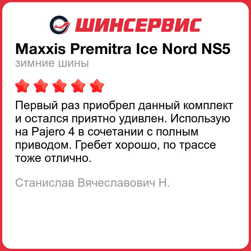 Шина Maxxis(Максис) Premitra Ice Nord NS5 235 R18 104T зимняя автомобильная шипованная обладающие металлическими шипами. Она предназначена для использования на снегу и льду. Шина Maxxis(Максис) Premitra Ice Nord NS5 235 R18 104T зимняя автомобильная шипованная отличается от фрикционной липучки разных производителей не только наличием шипов, но и температурным диапазоном эффективной работы. Состав резиновой смеси для шипов всегда делают твёрже, чем для «липучки», которая эластичнее на сильном морозе. Отличное сцепление на льду и укатанном снегу.
