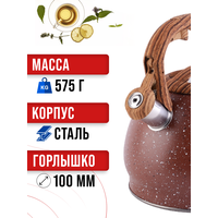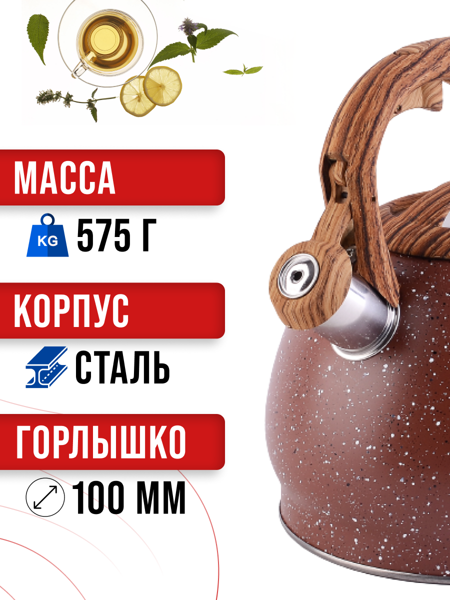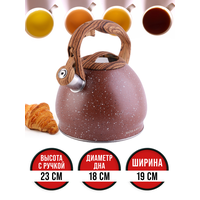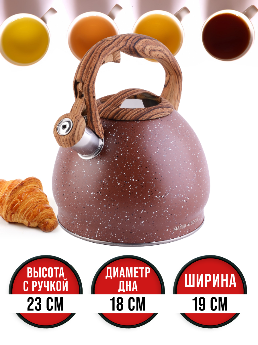 Название MAYER BOCH Чайник 30966-30965-30964 3 л. Тип чайник. Объем 3 л. Материал корпуса нержавеющая сталь. Тип варочной поверхности газовая, индукционная, стеклокерамическая, электрическая. Тип полировки матовая. Особенности индукционное дно, со свистком, термоизолированная ручка. Материал крышки бакелит, нержавеющая сталь, пластик. Материал ручки нейлон. Вид ручки фиксированная. Мытьё в посудомоечной машине да. Высота 23 см. Диаметр дна 18 см. Вес 0.75 кг. Комплектация Чайник с крышкой - 1 шт. Дополнительная информация крышка: нержавеющая сталь, полипропилен (РР); носик: полипропилен (РР); дно: капсулированное-индукционное; размер упаковки: 20 х 20 х 24 см, страна производитель: Китай. Цвет коричневый-мраморная крошка.